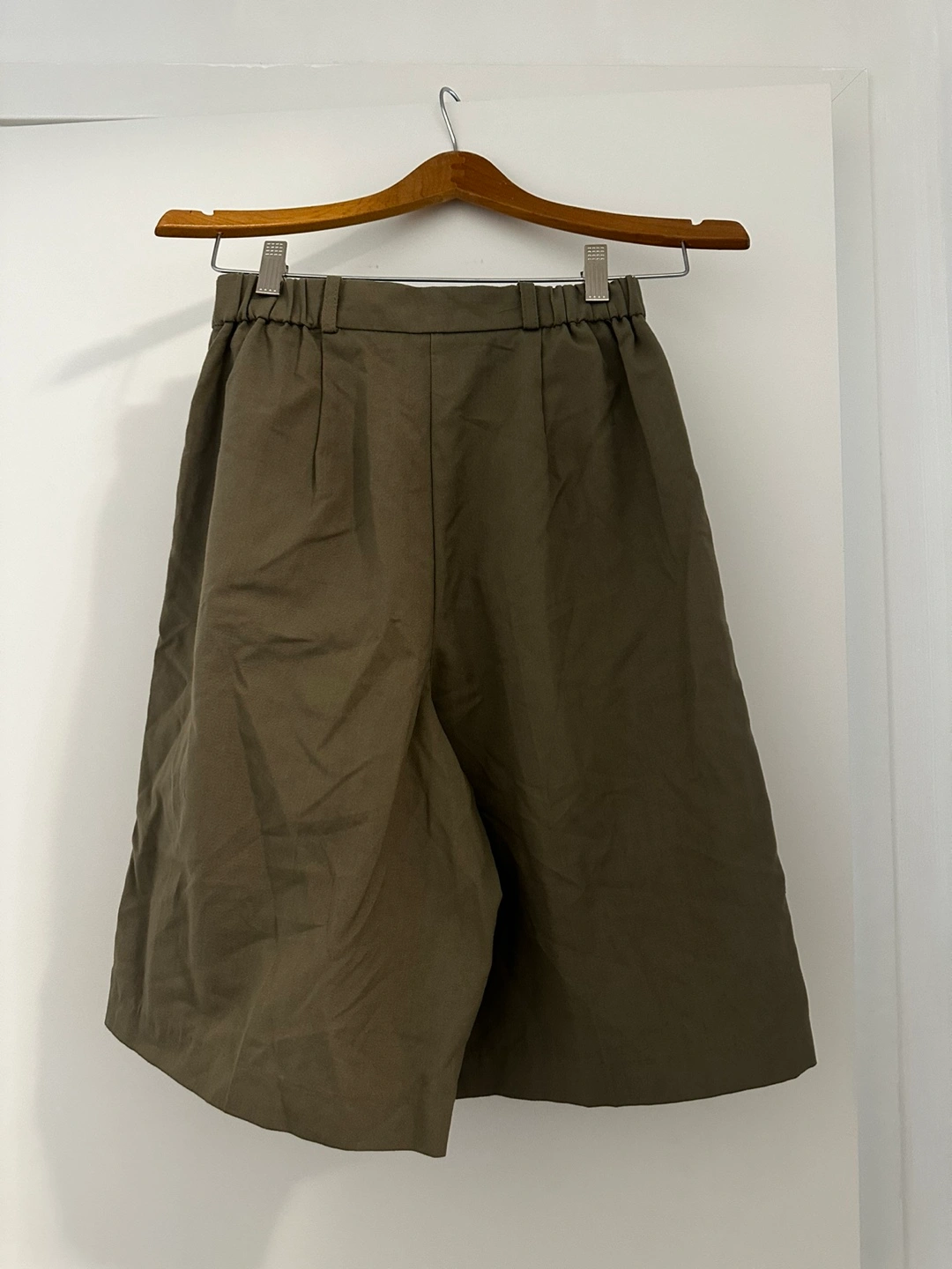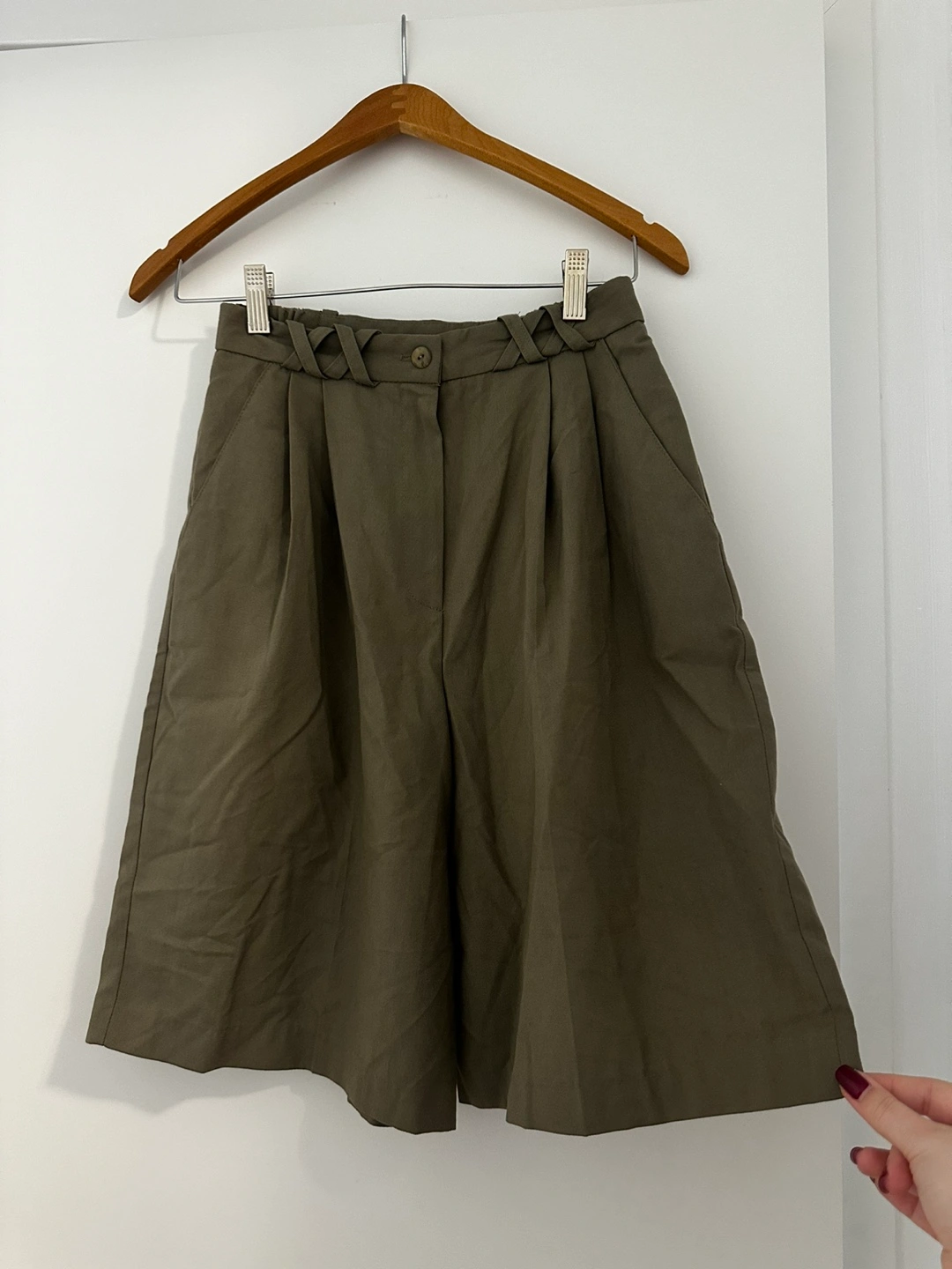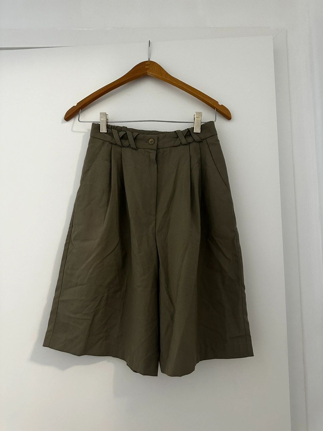 Olive green high waisted shorts. Pleated and flowy with a braided detail at the waist. Zipper and button closure.