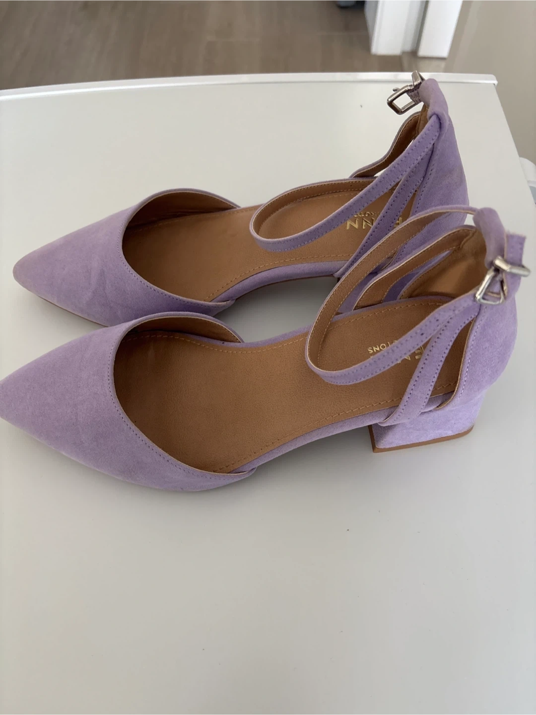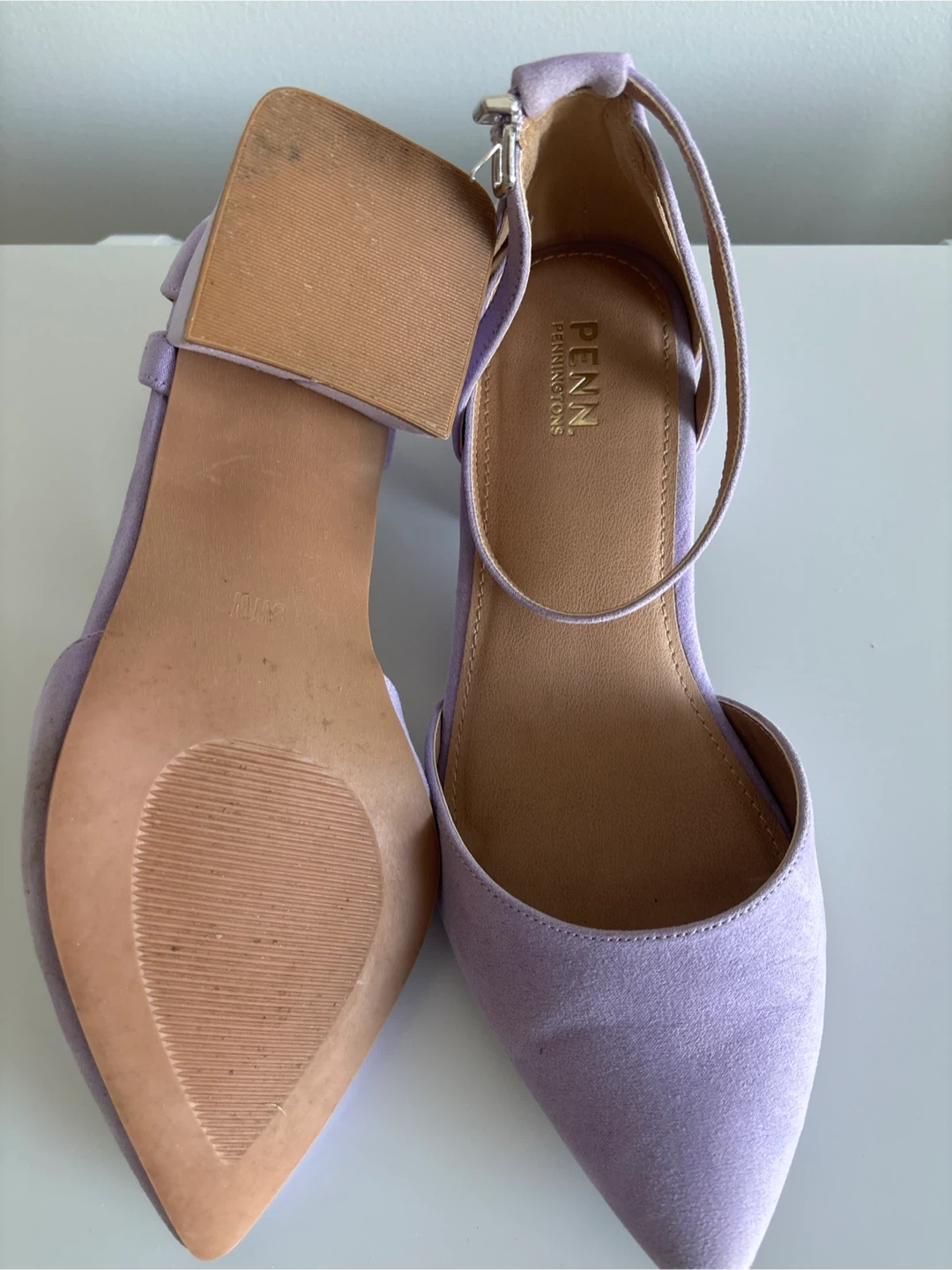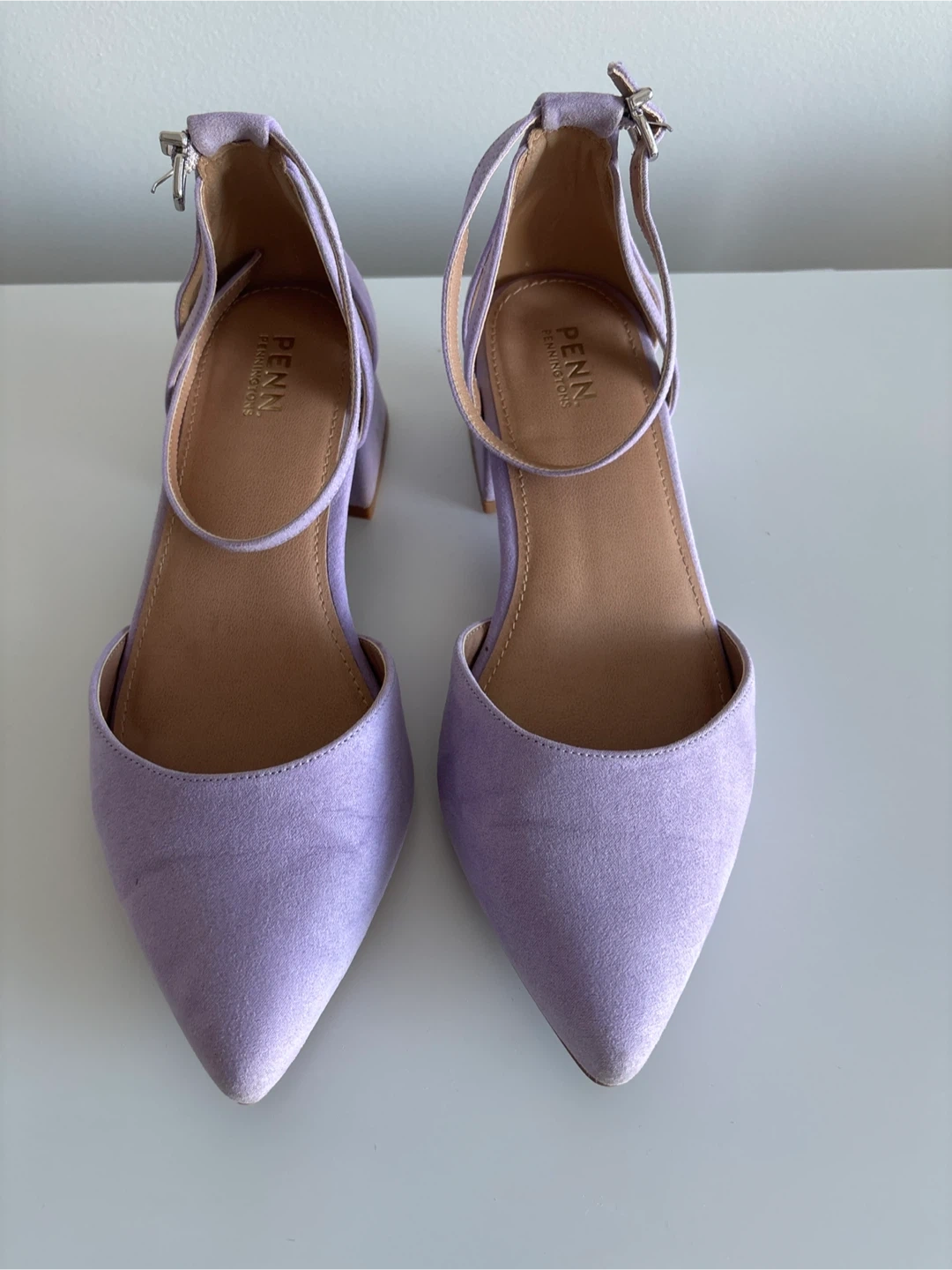 These Penningtons heels are a lovely lavender colour and feature a cute ankle strap. They are a women's size 9WW. Perfect for dressing up or adding a pop of colour to your outfit! Only worn once.