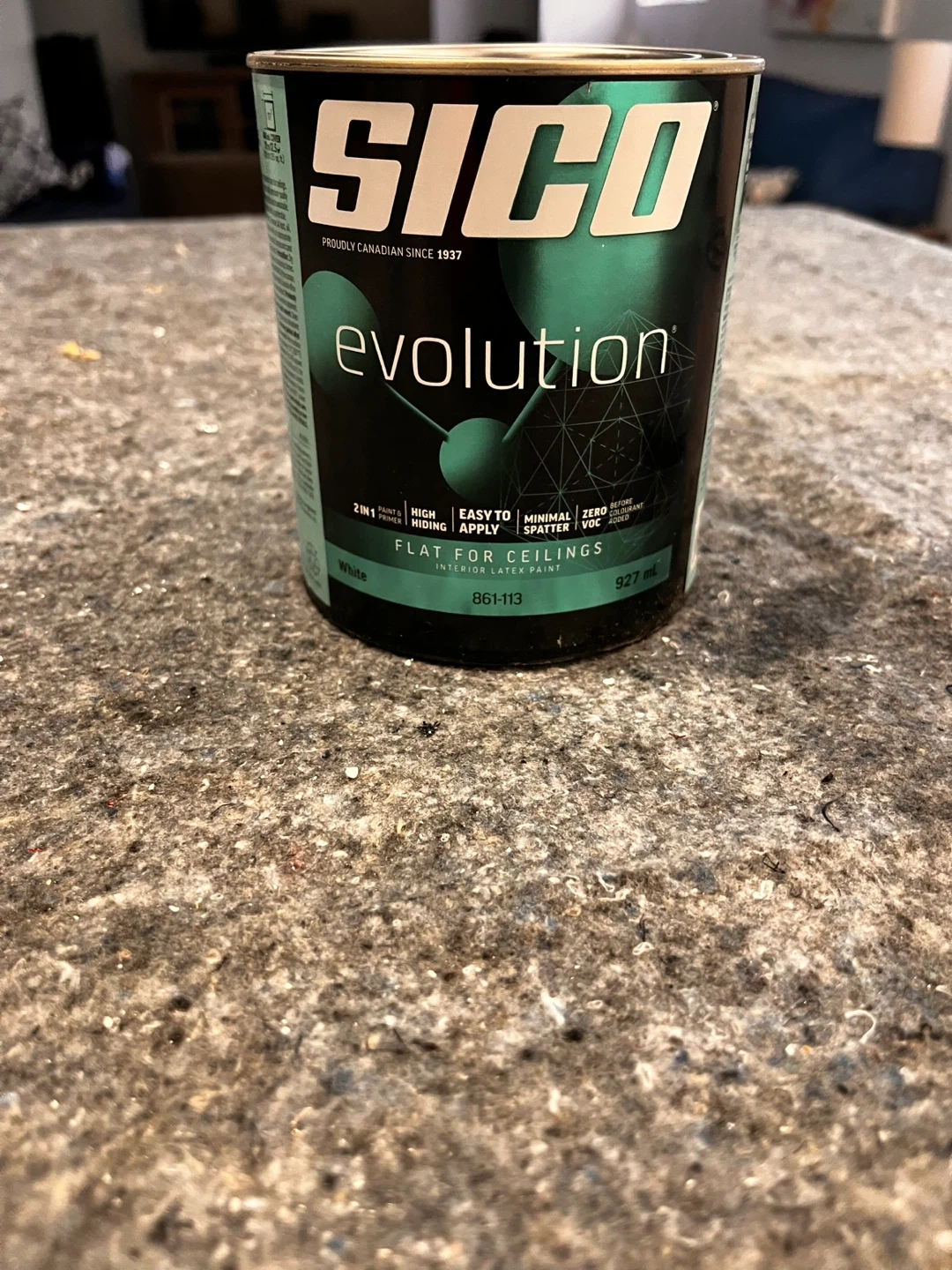 Selling a can of Sico Evolution interior latex paint, perfect for ceilings! It's a 2-in-1 paint and primer that offers high hiding and is easy to apply. This flat white paint is designed to minimize spatter and has zero colourant added. The can contains 927 ml of paint. Not used. 100% full.