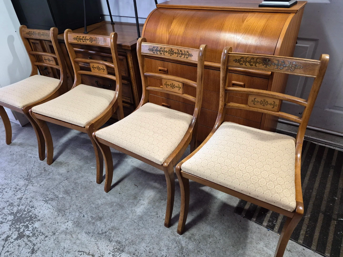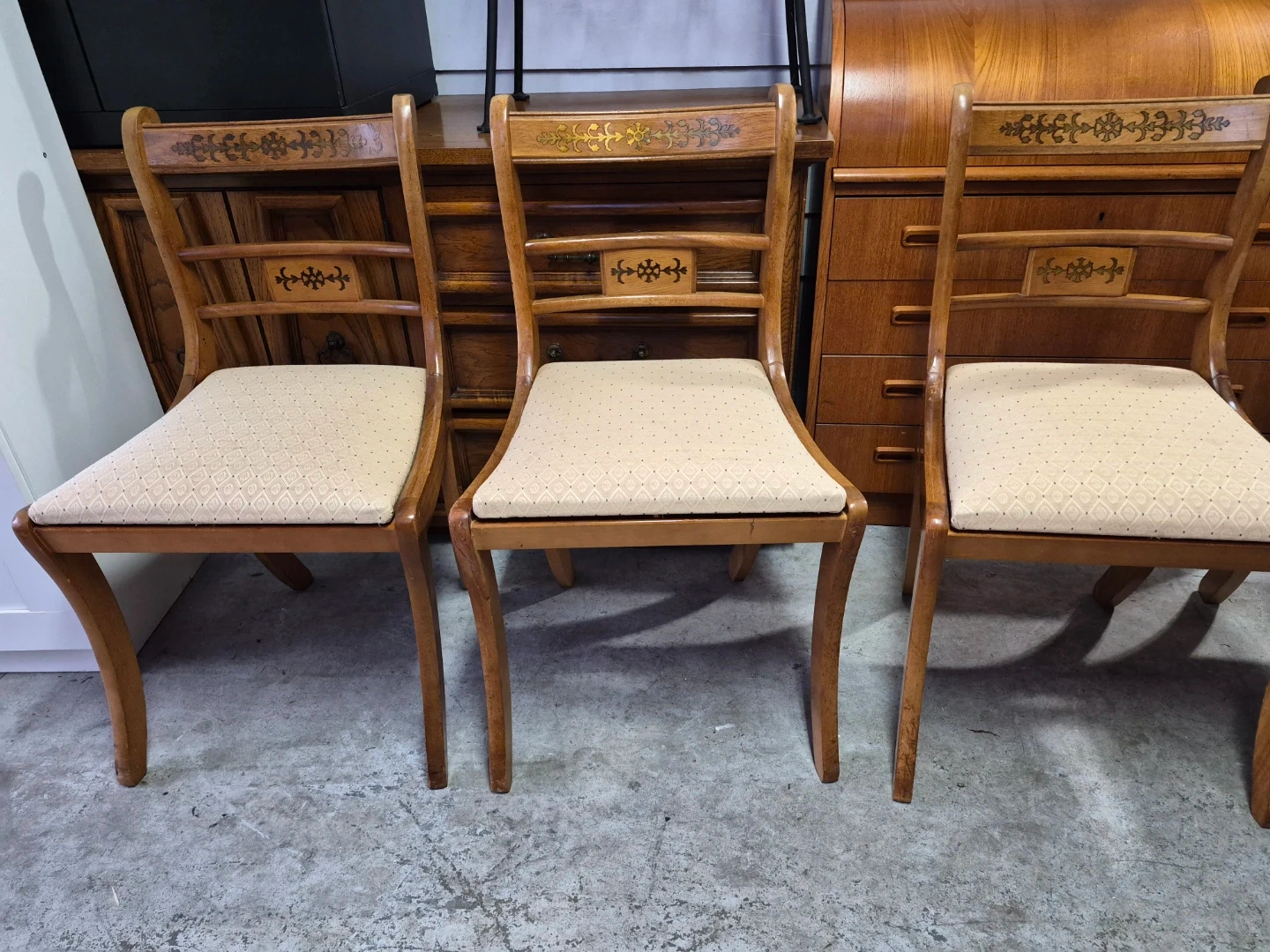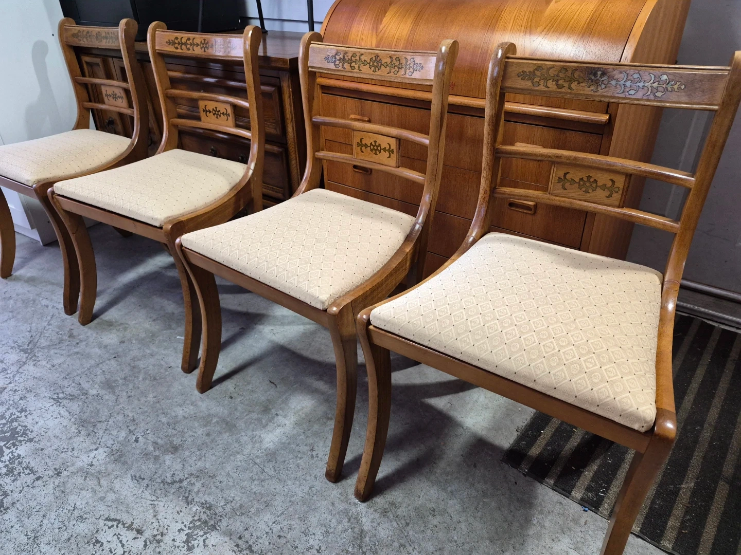 This set includes four wooden dining chairs featuring upholstered seats. The chairs have decorative inlays on the backrests and elegant curved legs. They appear to be made of a light-coloured wood with a natural finish. The upholstery is a neutral, patterned fabric.