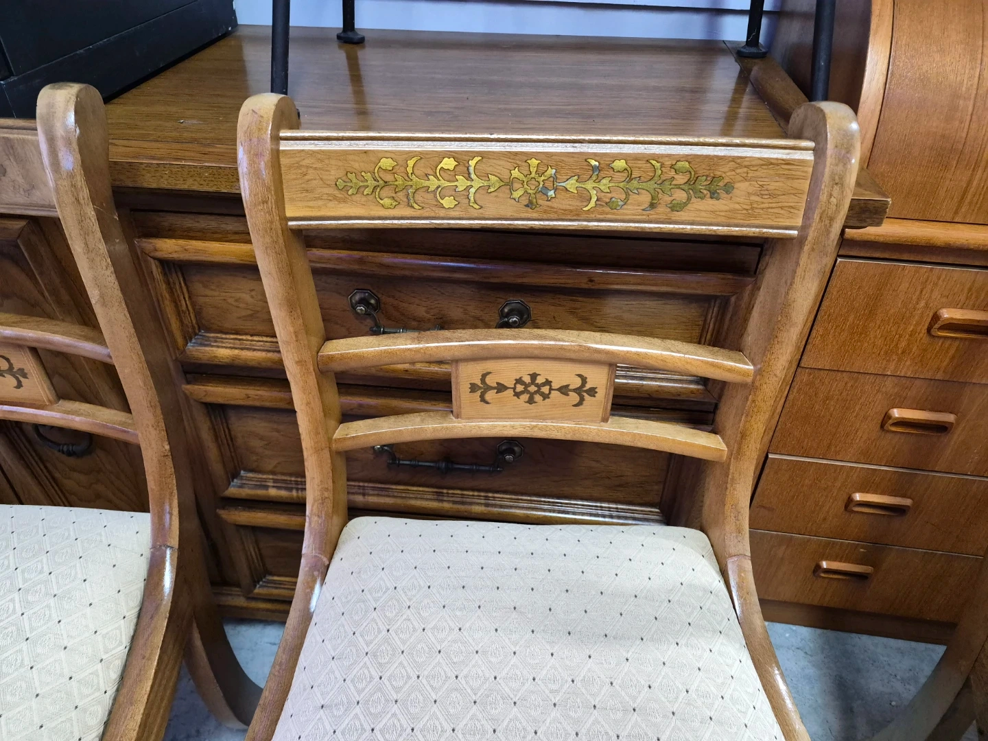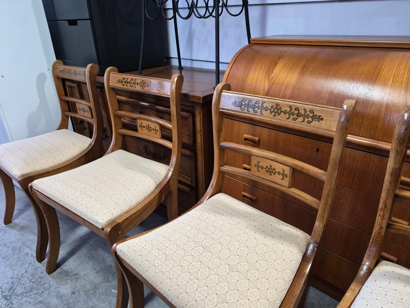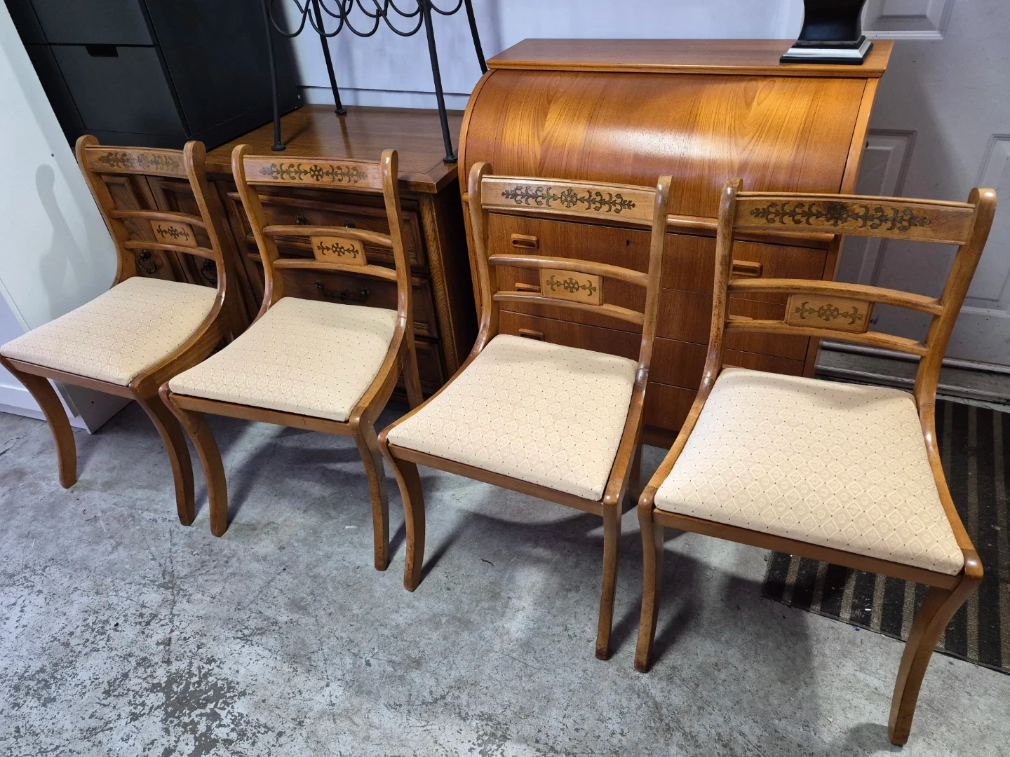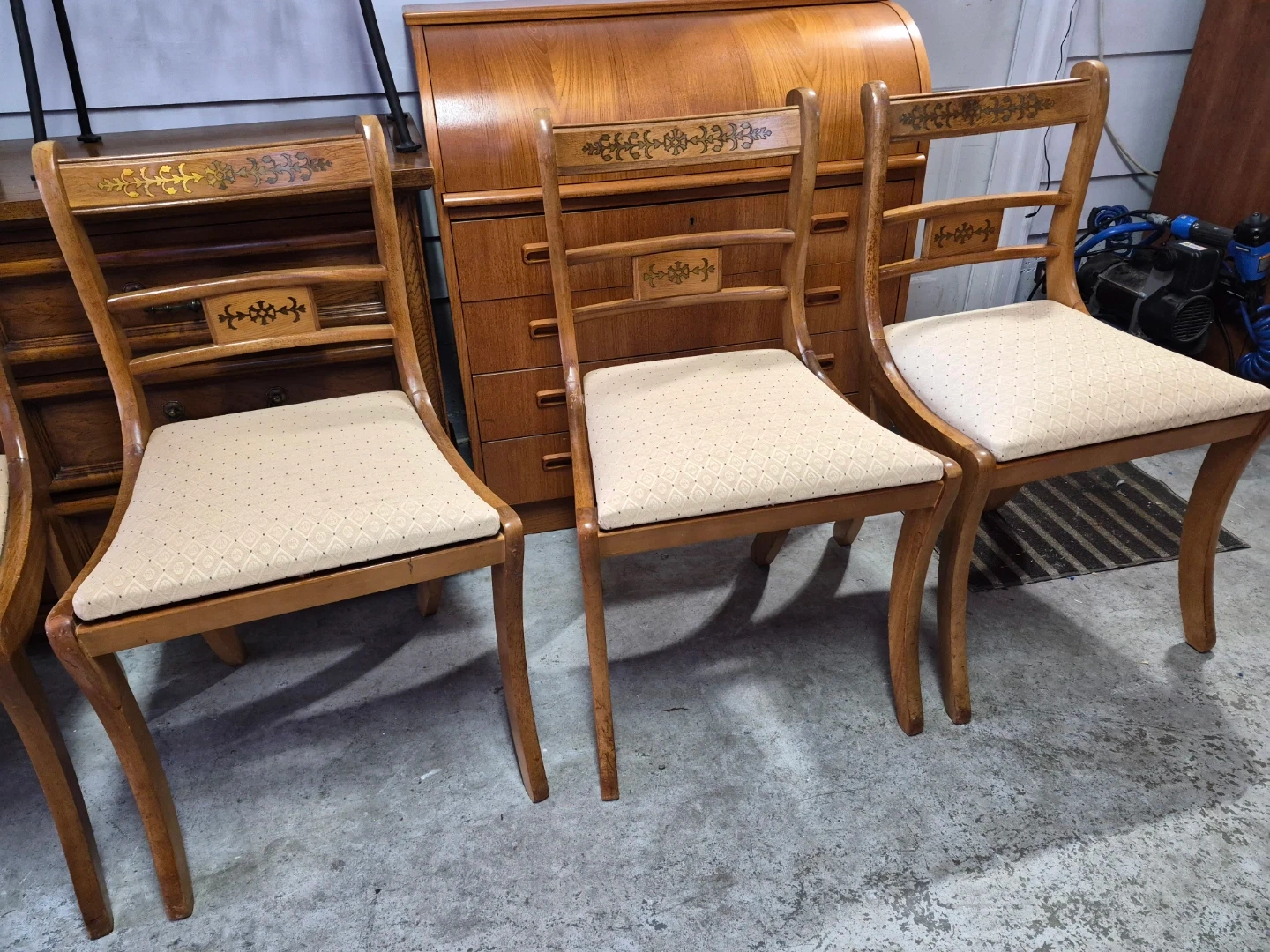 This set includes four wooden dining chairs featuring upholstered seats. The chairs have decorative inlays on the backrests and elegant curved legs. They appear to be made of a light-coloured wood with a natural finish. The upholstery is a neutral, patterned fabric.