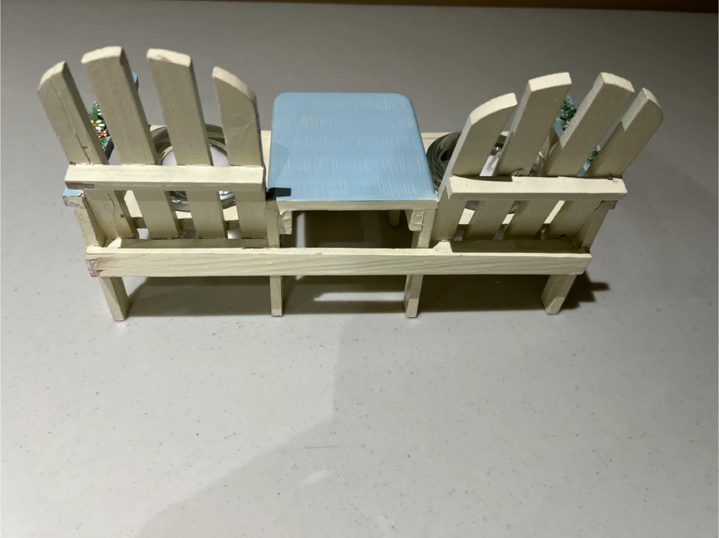 This charming candle holder is designed to look like a miniature Adirondack chair set with a small table in between. It includes two glass votive holders, perfect for adding a cozy ambiance. It's crafted from wood with a hand-painted floral design.