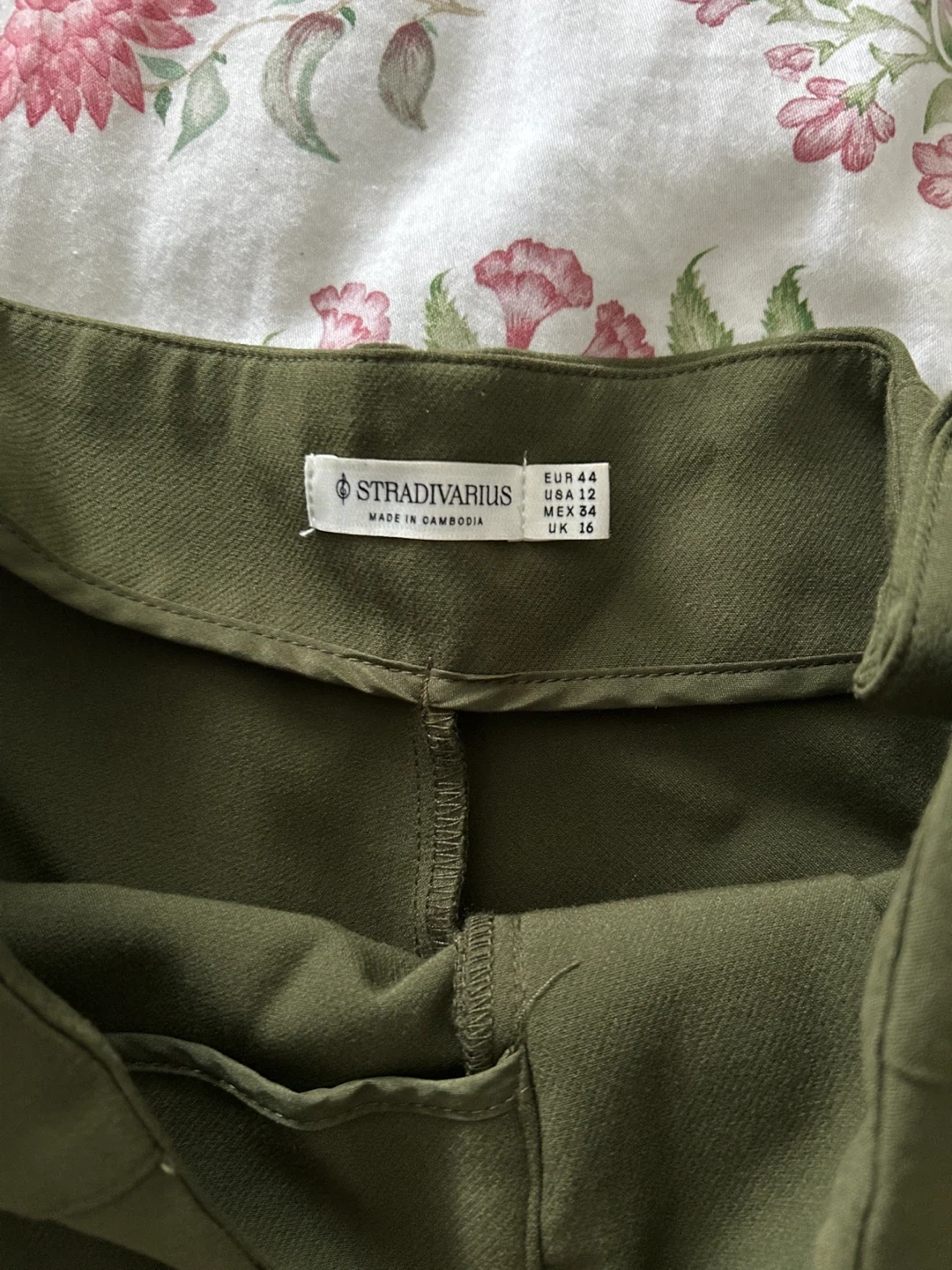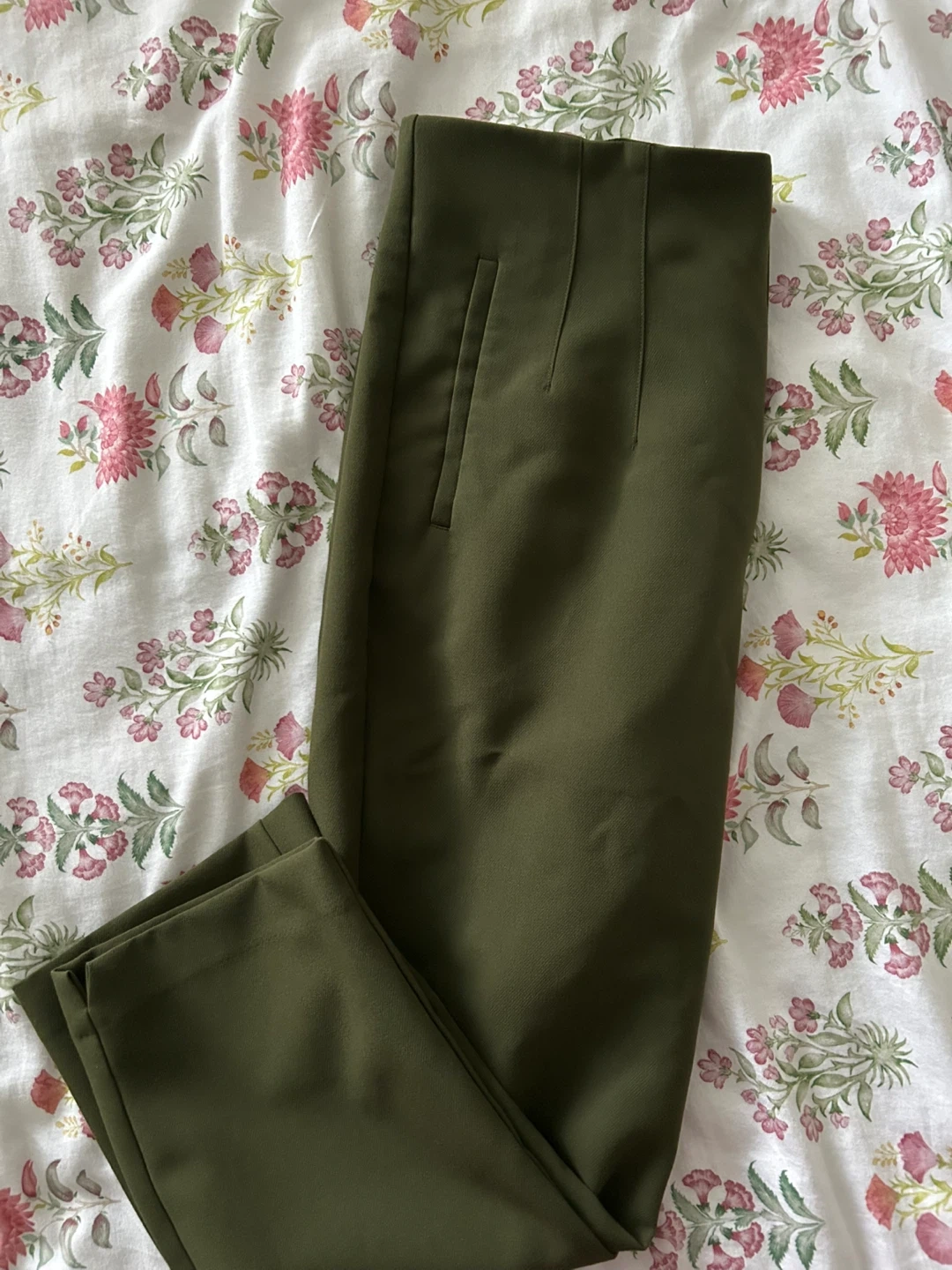 These are Stradivarius olive green trousers. They're a size 12 US. The material appears to be a blend, offering a smooth finish. Perfect for work or casual wear!