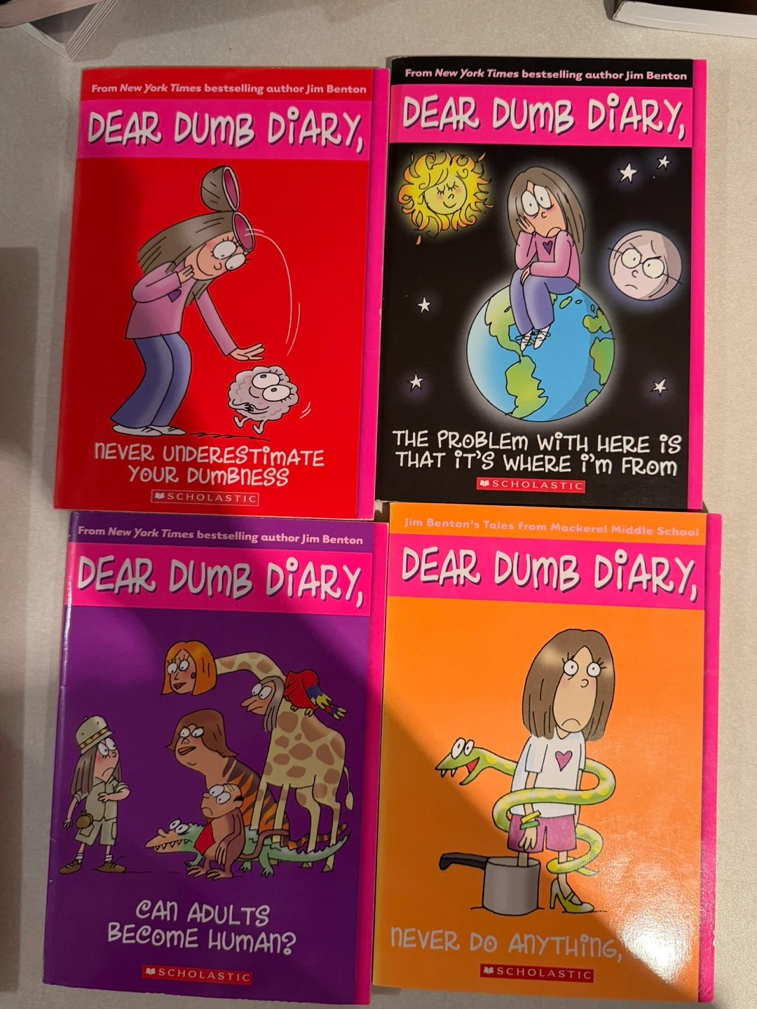 This is a collection of four 'Dear Dumb Diary' books by Jim Benton. They're paperback novels. Great for young readers who enjoy humour and relatable school stories!