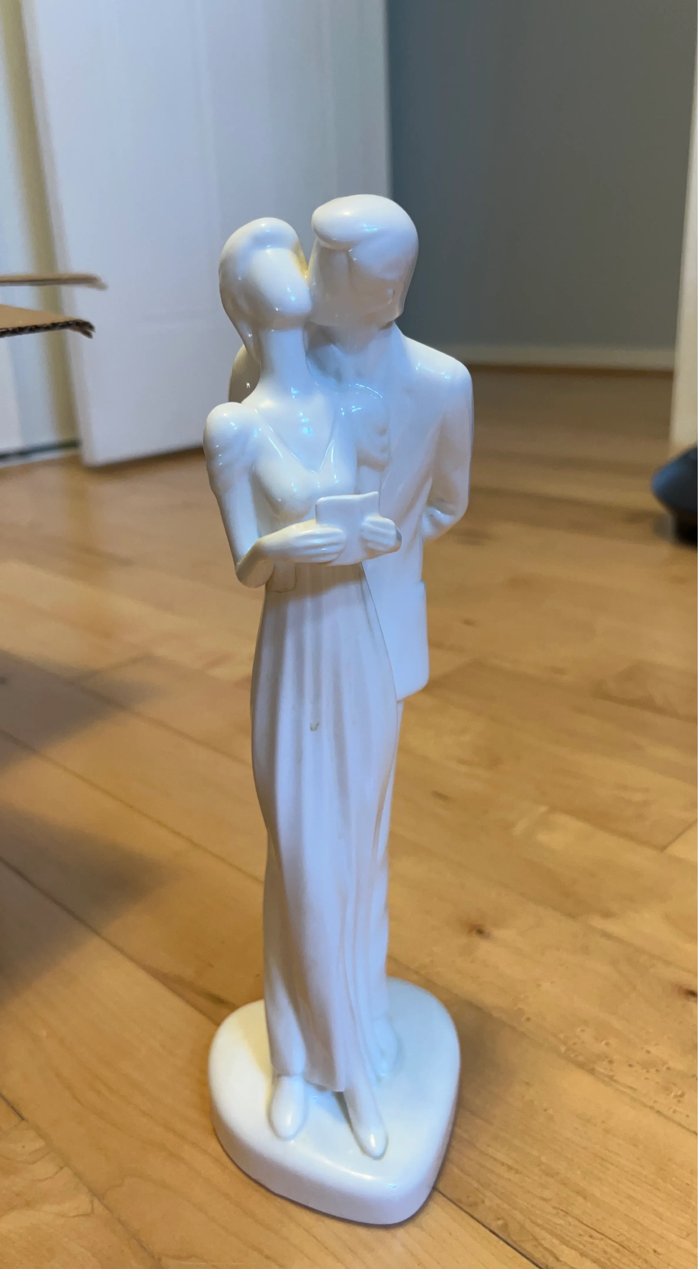 This white ceramic figurine depicts a couple embracing. It's about 8 inches tall and features a smooth, glossy finish. A lovely decorative piece for any home!