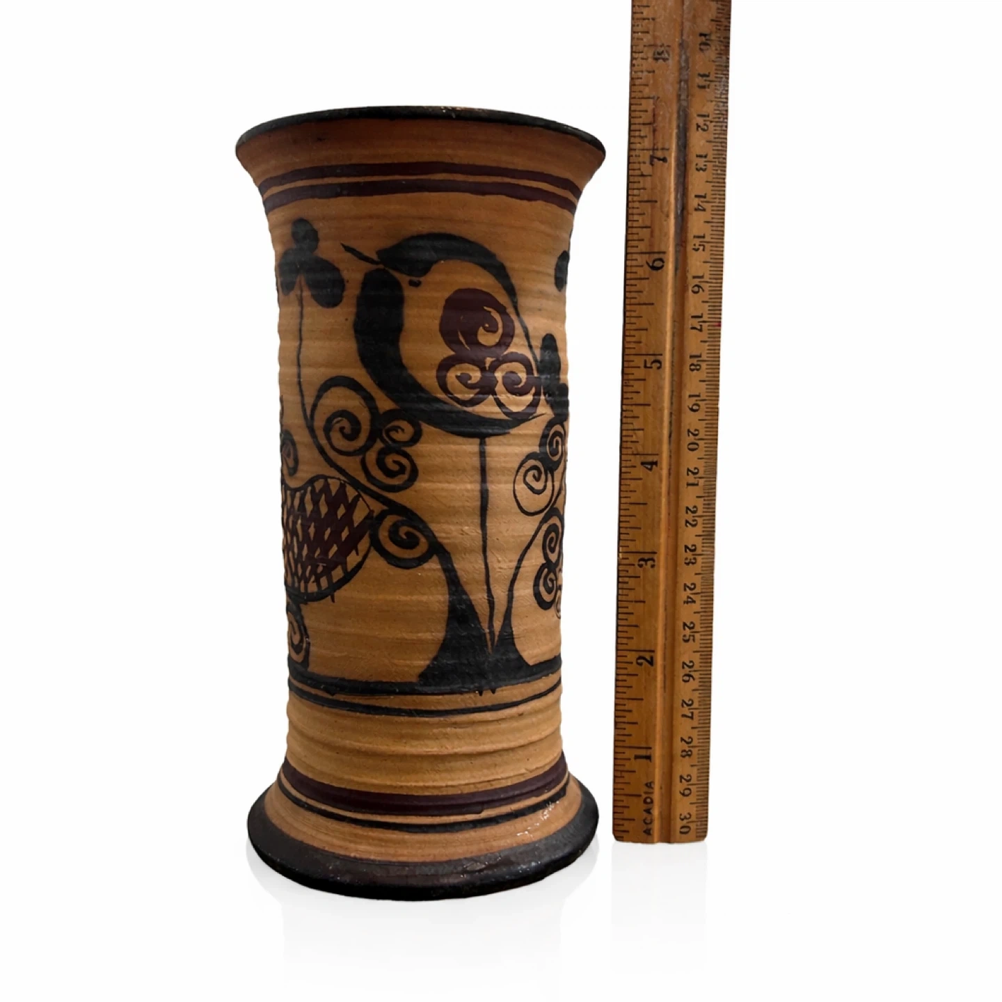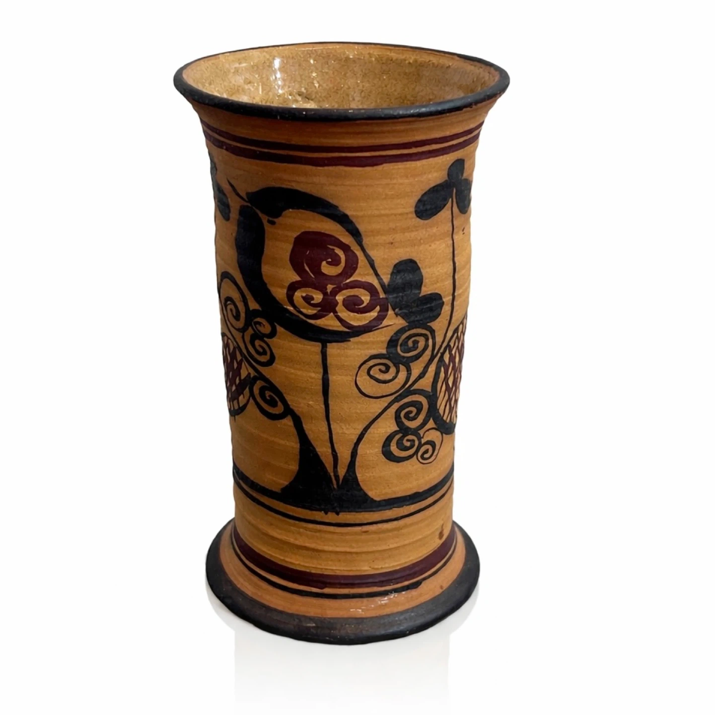 A finely proportioned YAEL-marked vase with bold, folk-modern floral ornament—scrolling vines, stylized blossoms, and cross-hatched cartouches—painted in deep iron-black and aubergine tones over a warm buff body. The form is classic and architectural: a gently waisted cylinder rising to a clean flare at the mouth, anchored by a stable foot. Strong shelf presence; equally effective as a small vase or decorative vessel.