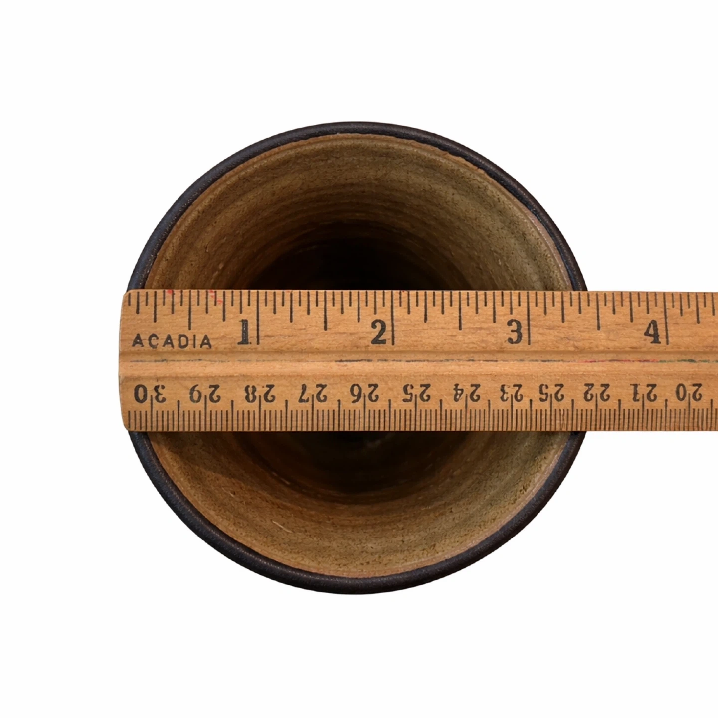 Thrown earthenware with hand-painted slip/oxide decoration under a clear glaze (gloss present, especially to the interior). The stamp includes the word “LEAD”; accordingly, the piece is best treated as decorative and not represented for food use.