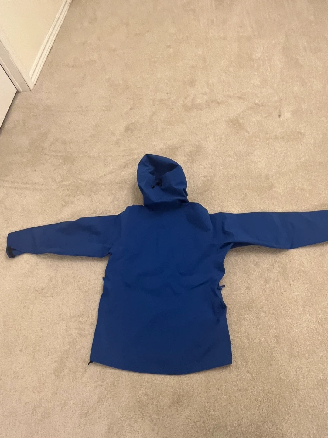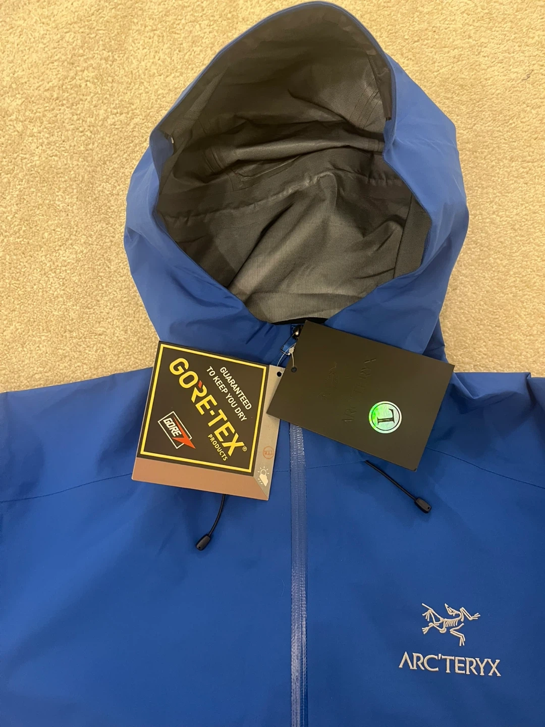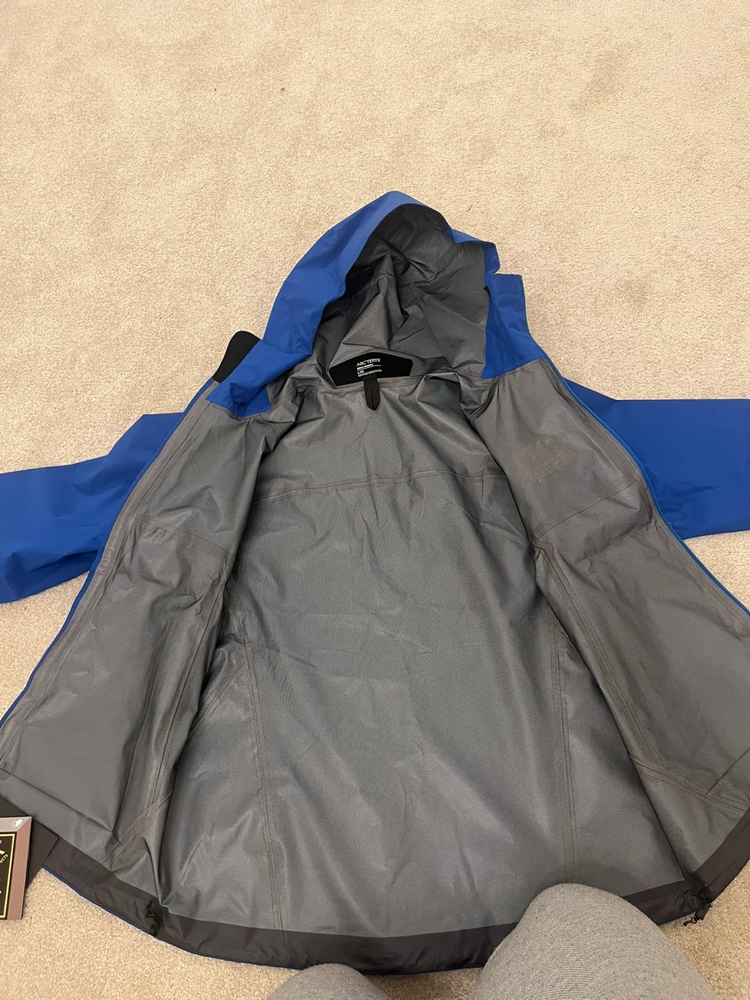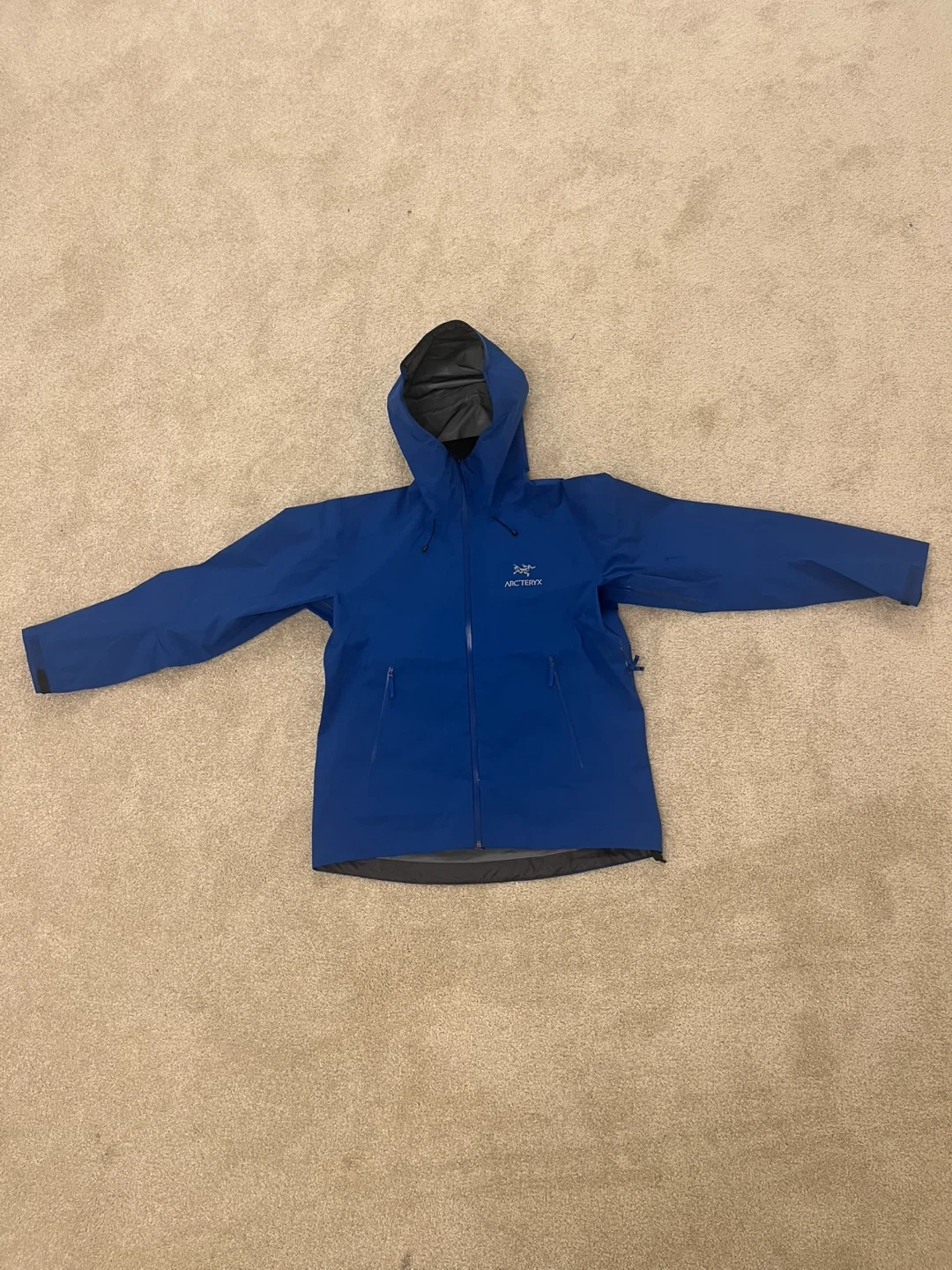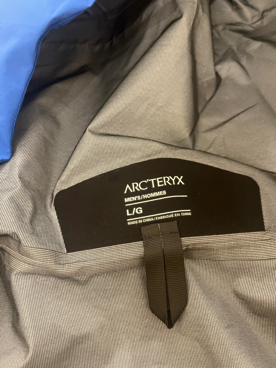 Arc'teryx men's jacket in blue, size L. Made with Gore-Tex for waterproof protection. Features a hood and zippered pockets.