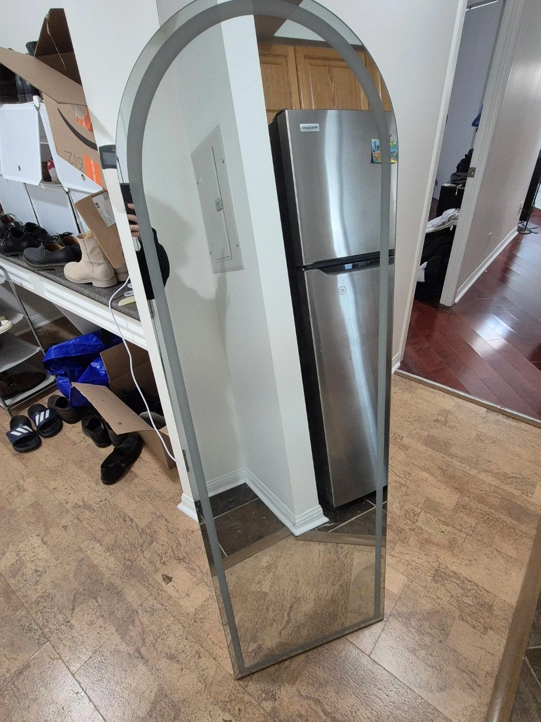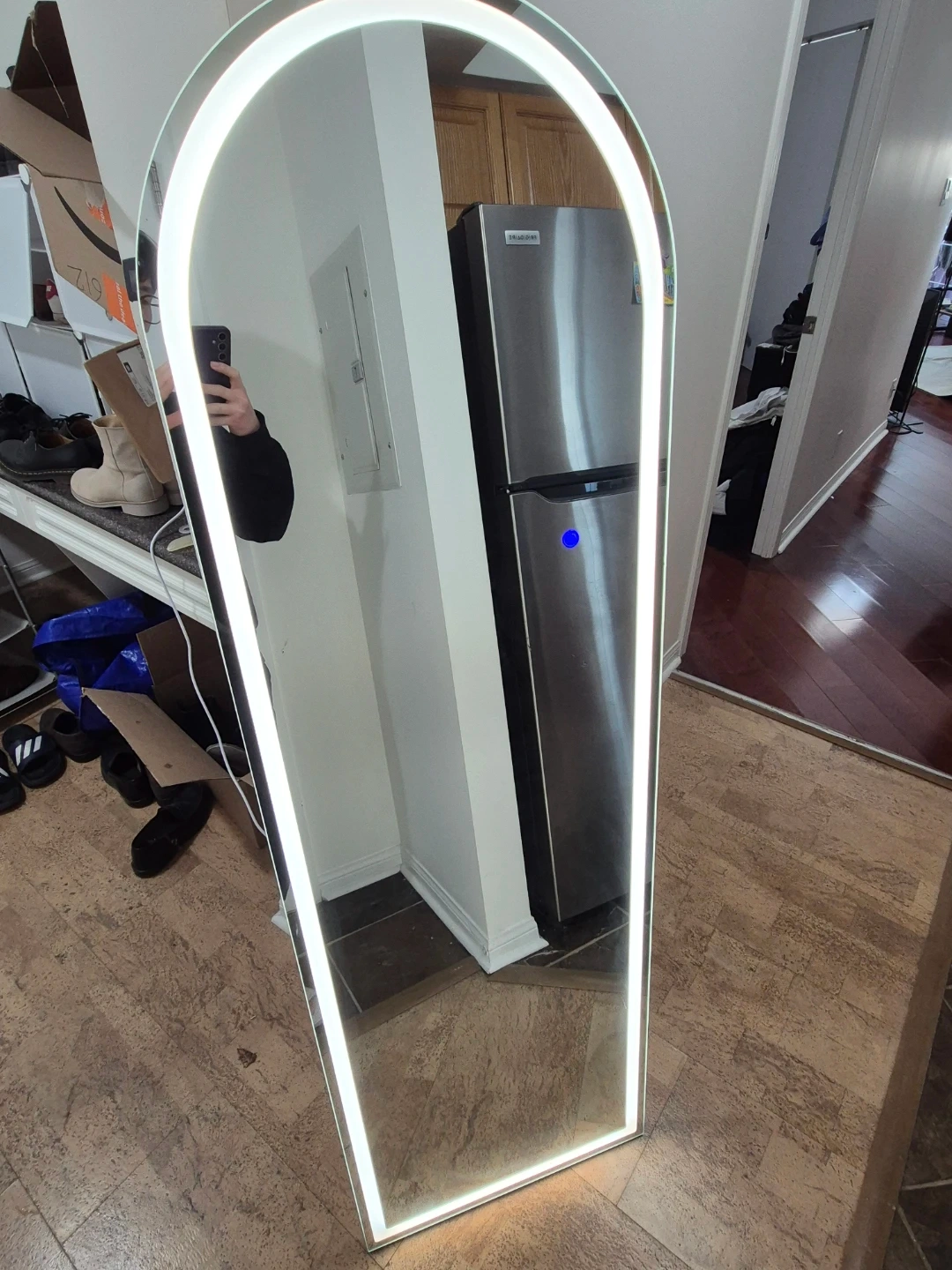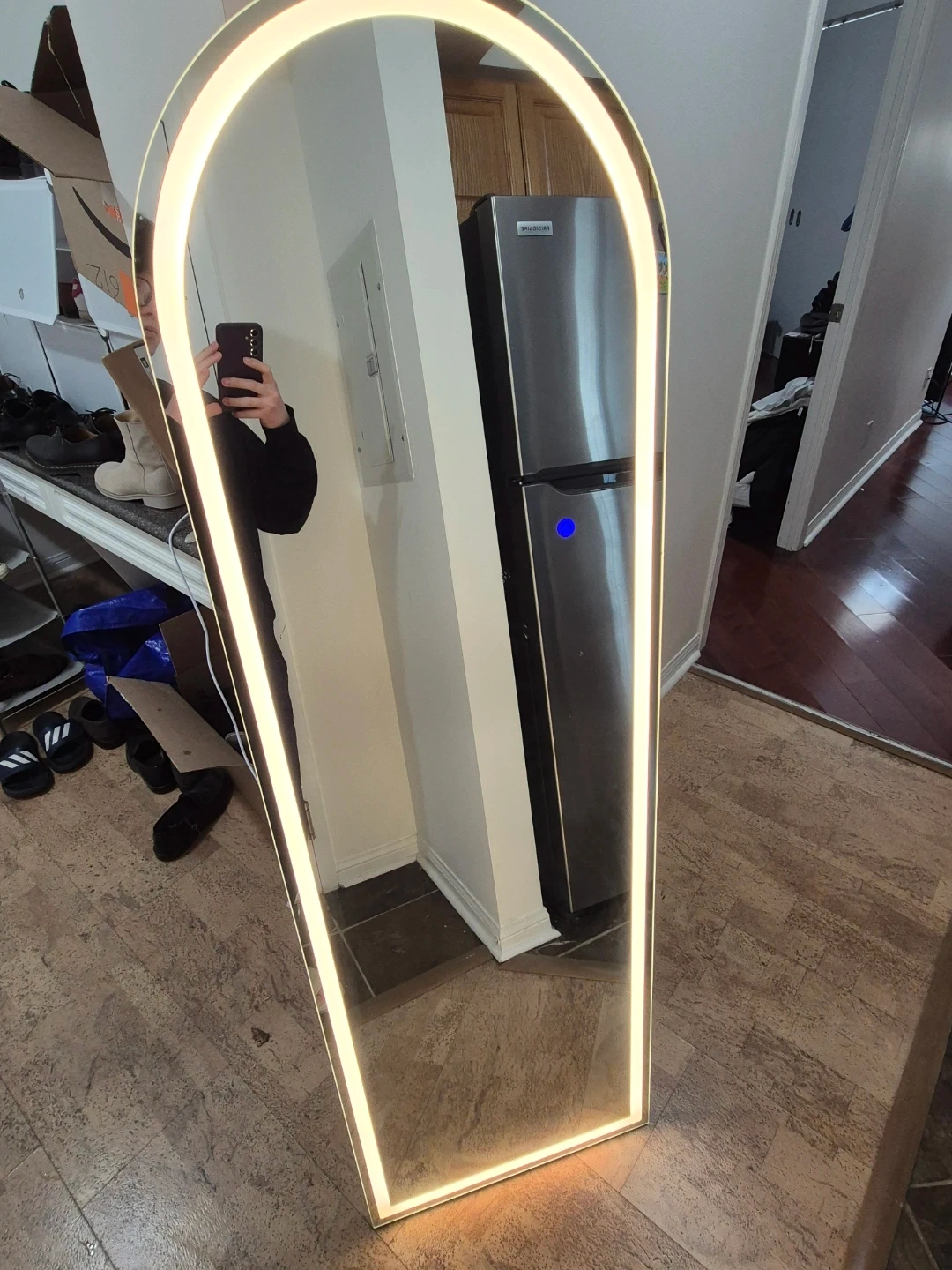 This is a tall, arched full-length mirror with a built-in LED light strip around the edge. The light provides a bright, even glow. It's perfect for checking your full outfit before heading out!