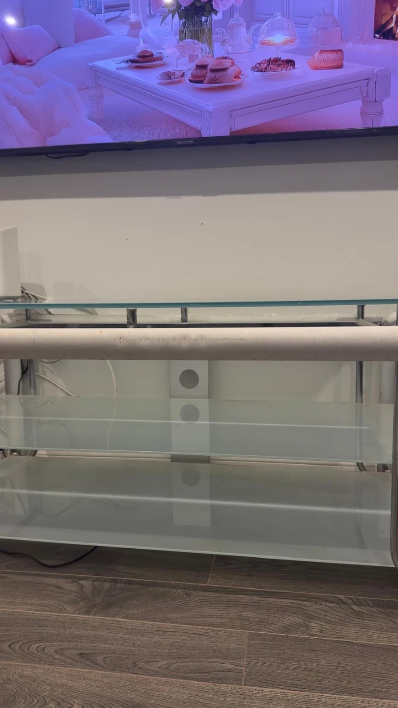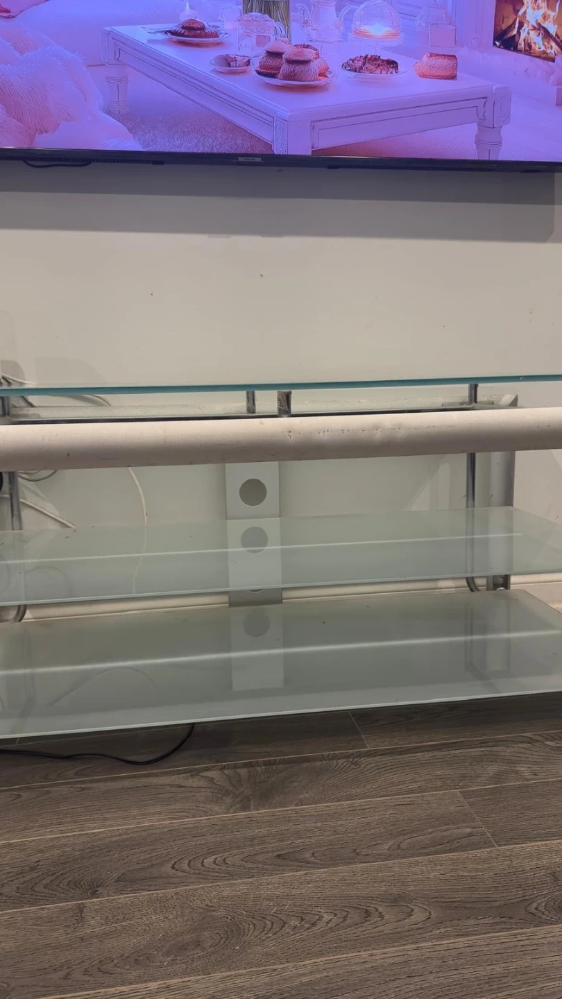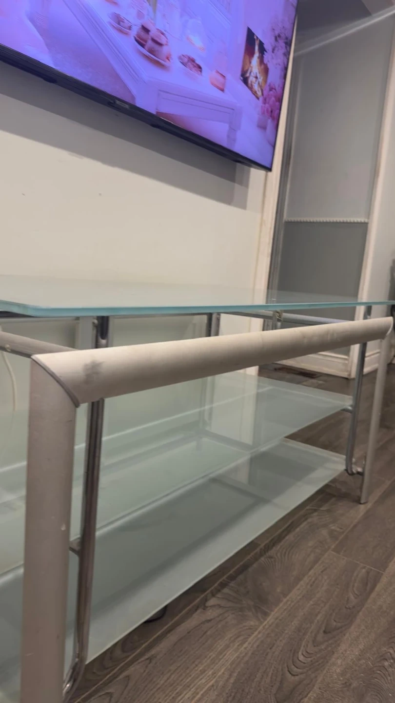 Spruce up your living space with this sleek glass TV stand! It's perfect for holding your television and media devices. It has a top glass shelf, a middle glass shelf and a bottom glass shelf. This stand is in used, great condition, and it's still sturdy and functional, with no cracks. It’s ready to find a new home and bring some modern flair to your entertainment setup!