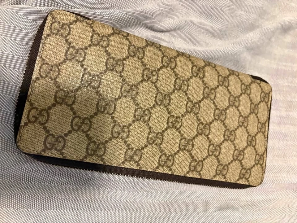 Selling a pre-owned authentic Gucci zip-around wallet in the classic GG canvas pattern.