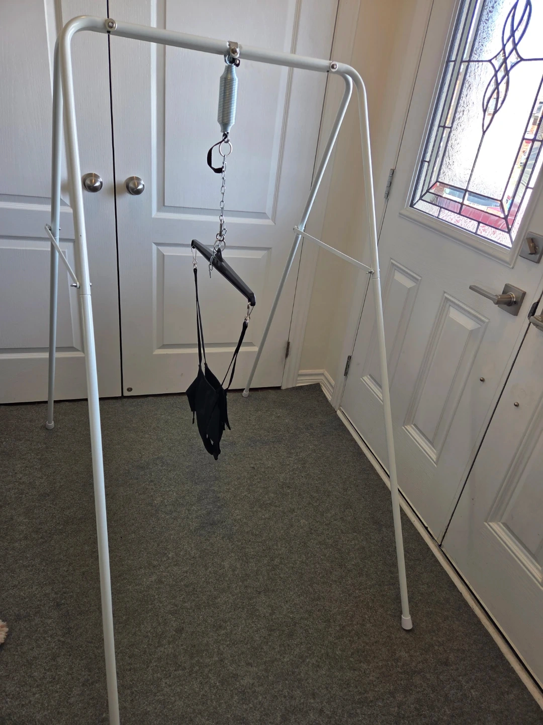 This Jolly Jumper Exerciser includes the stand for free-standing use. It's designed for babies to safely bounce and play. The exerciser has a black fabric seat and comes with a sturdy metal frame.