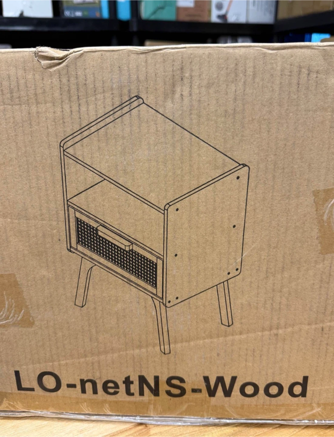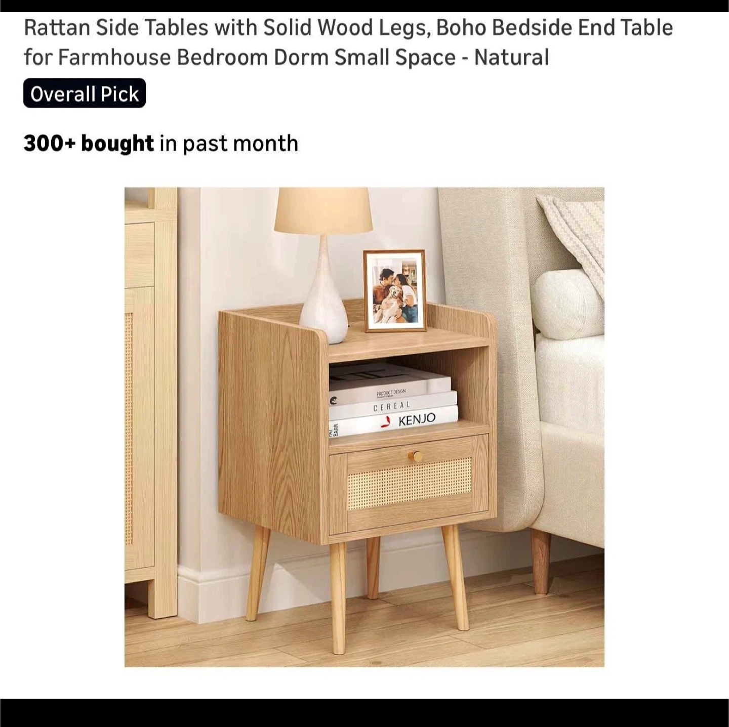 A rattan side table with solid wood legs. It's natural in colour. The overall dimensions are 15.9" wide, 11.8" deep, and 23.6" tall. This nightstand would be useful for small spaces.
