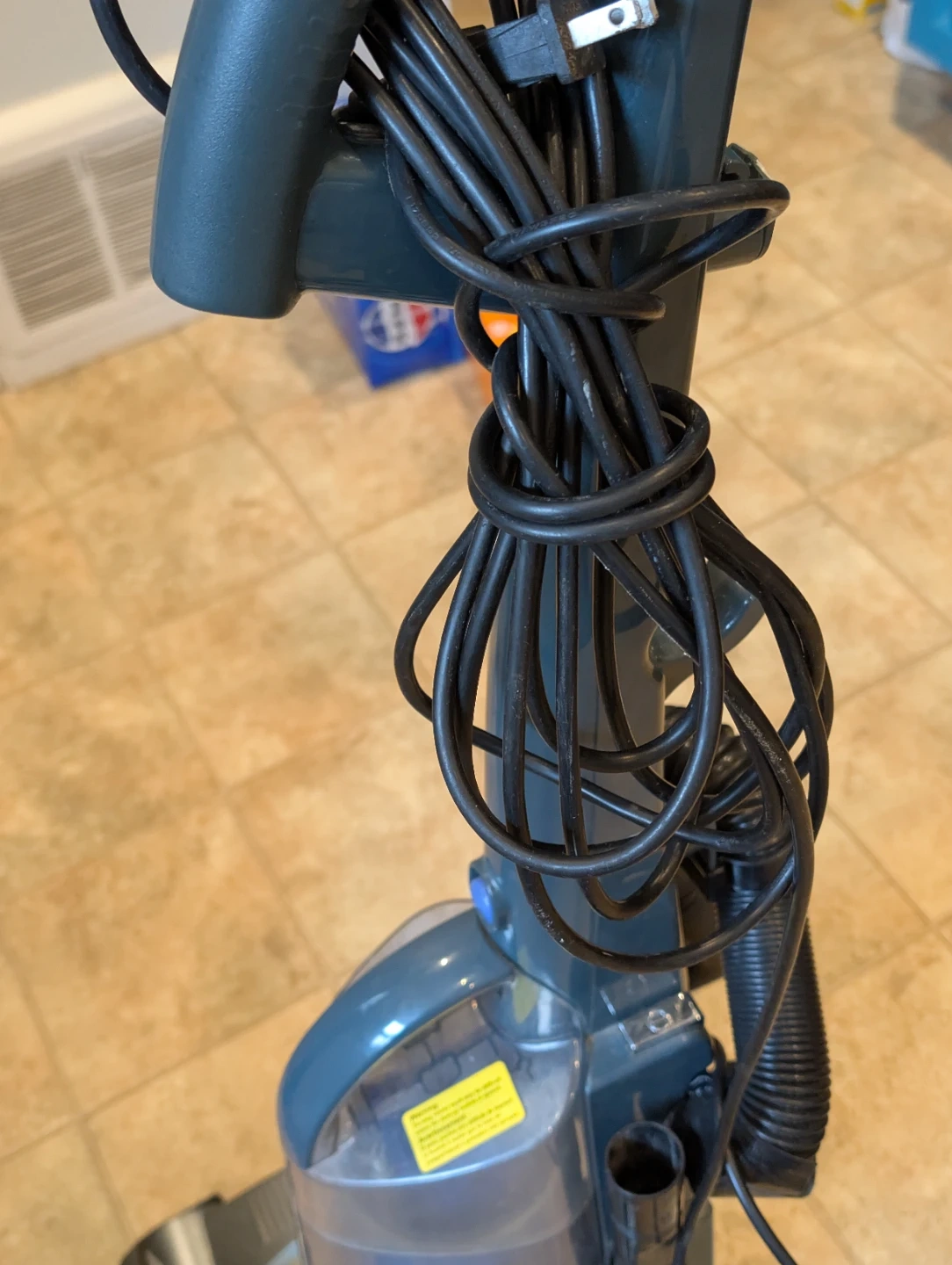 Upright vacuum cleaner with a bagless dustbin. It has a detachable hose and power cord. Works well for cleaning carpets and hard floors.