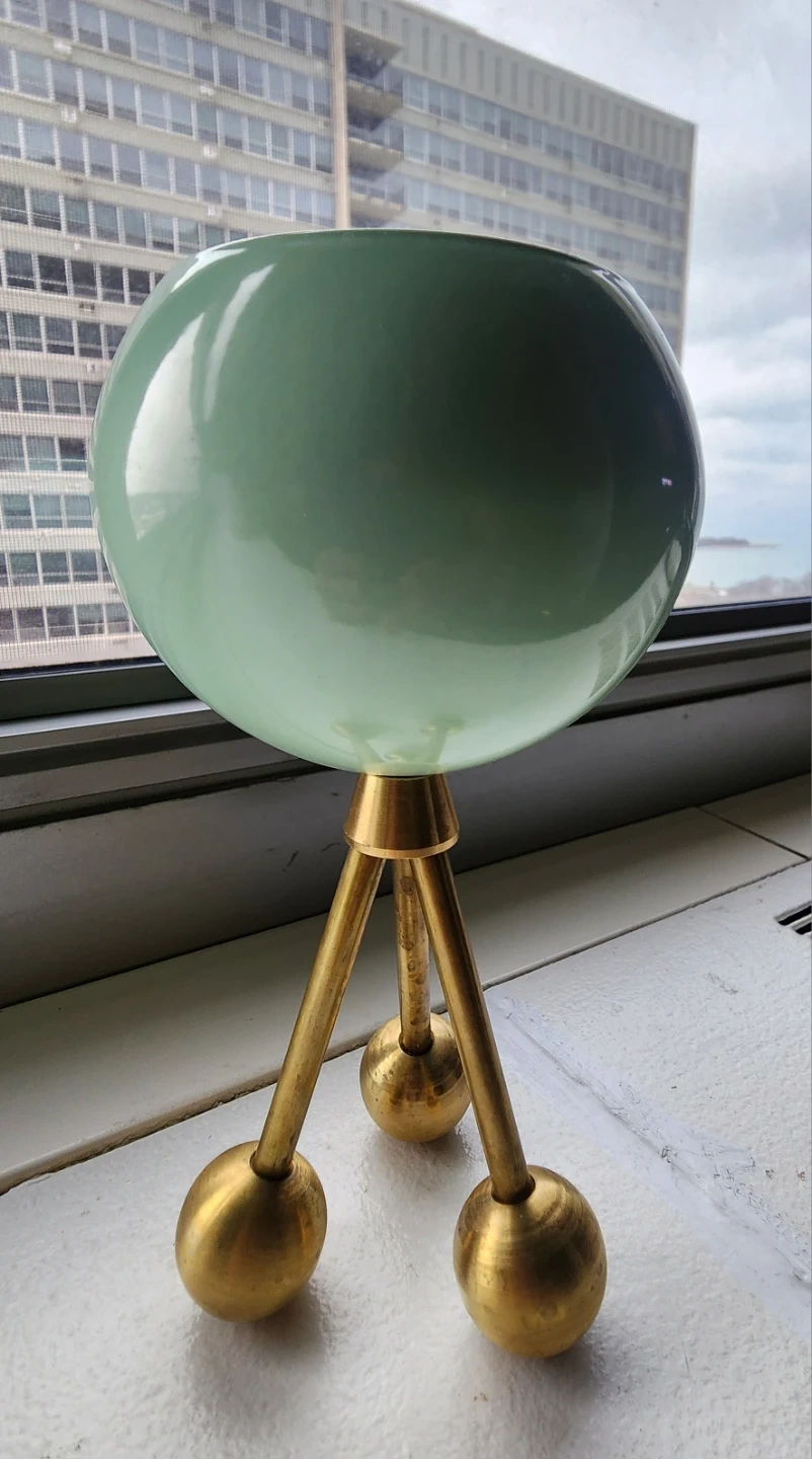 Here's a cute green globe planter with brass legs! It's perfect for adding a touch of mid-century modern style to your home or office