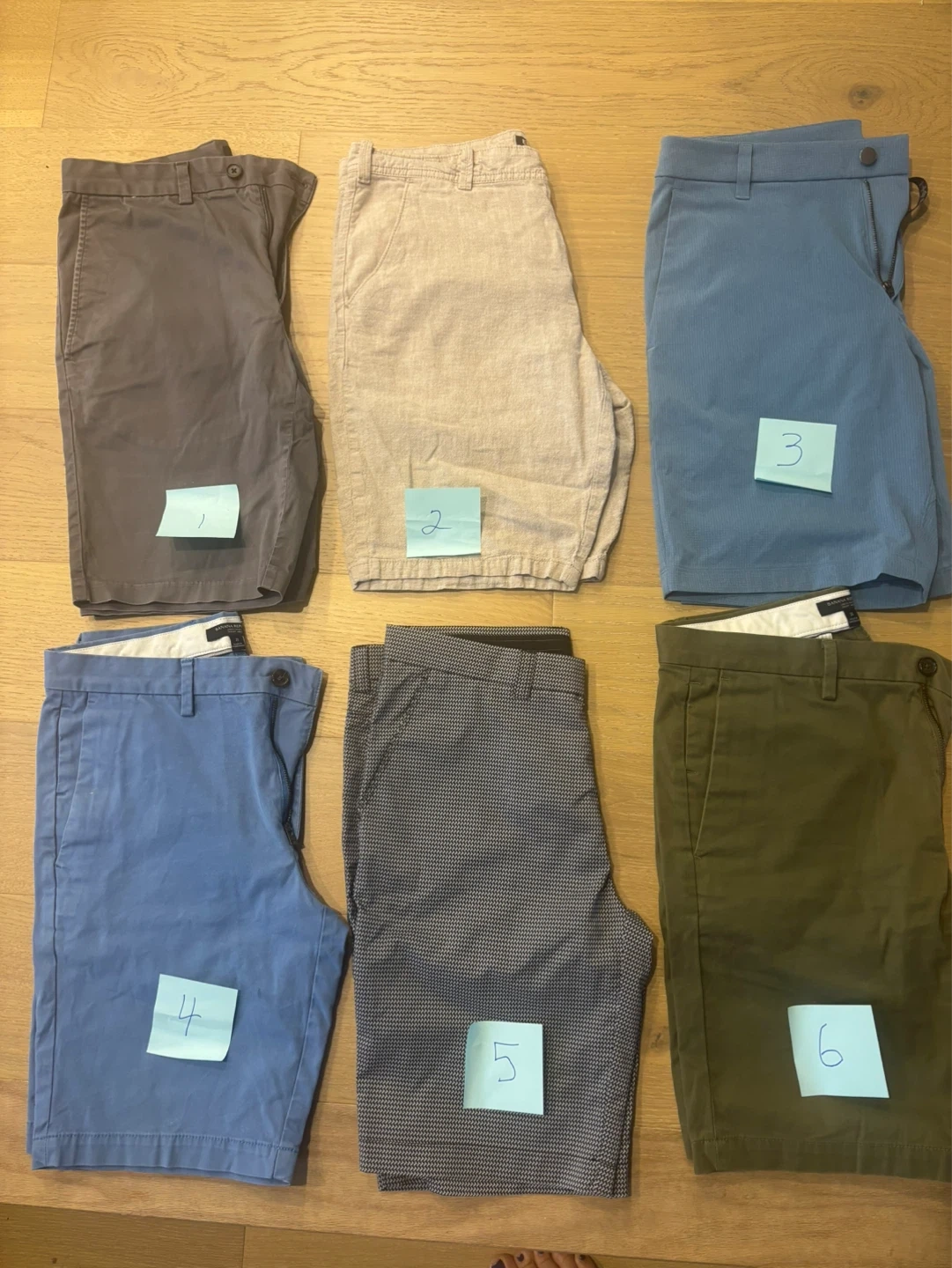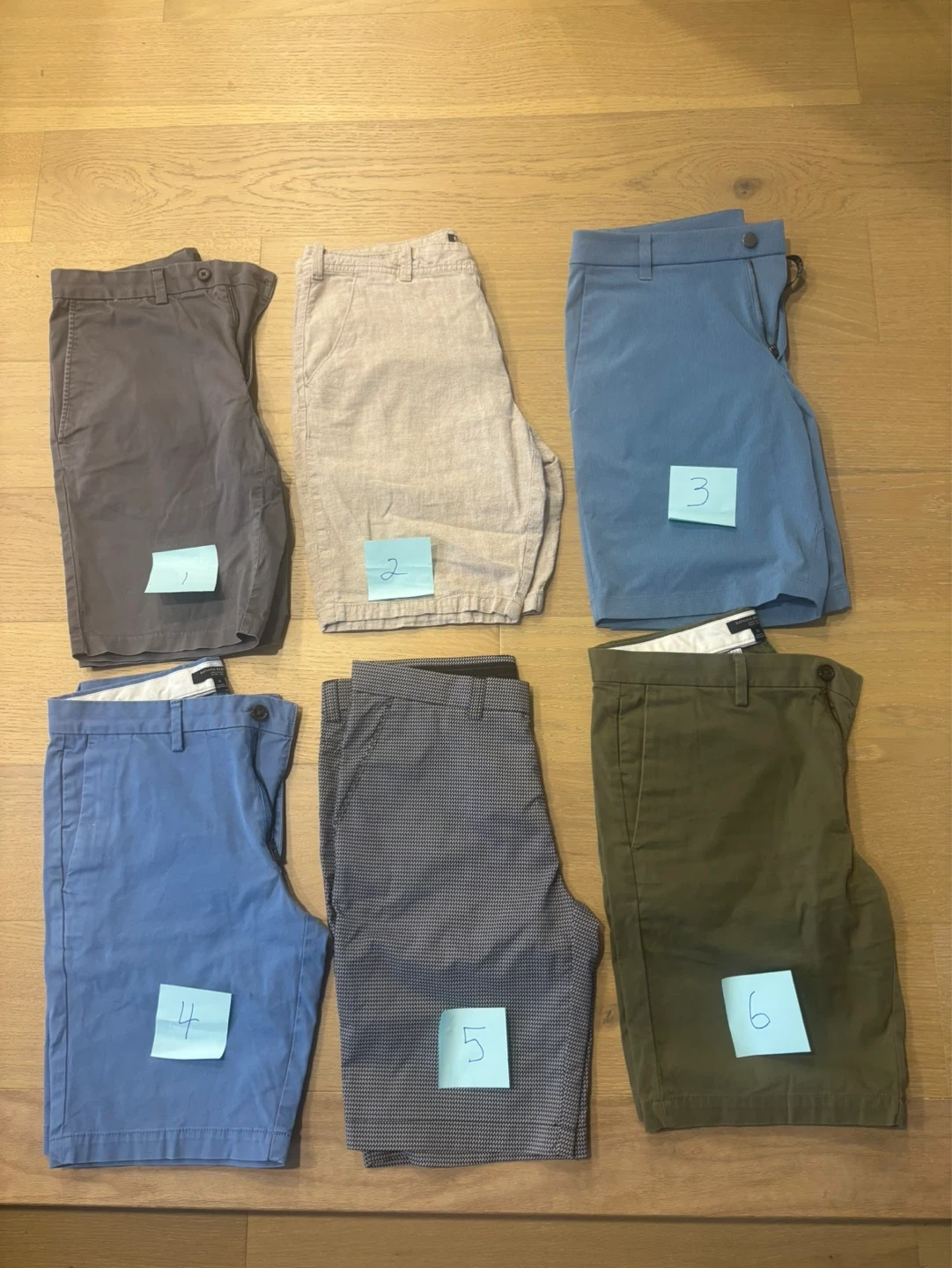 Bundle of six pairs of men's shorts in various colours including grey, beige, blue, and green. In great condition smoke free home: