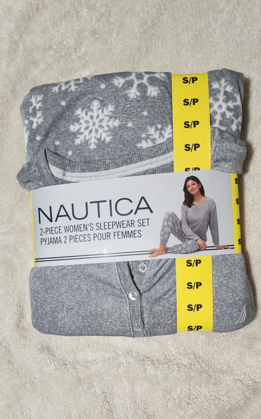 I'm selling a brand new Nautica 2-piece women's sleepwear set! The set includes a long-sleeved top and pants. The size is S/P (Small/Petite). It features a lovely snowflake pattern. Perfect for cozy nights!