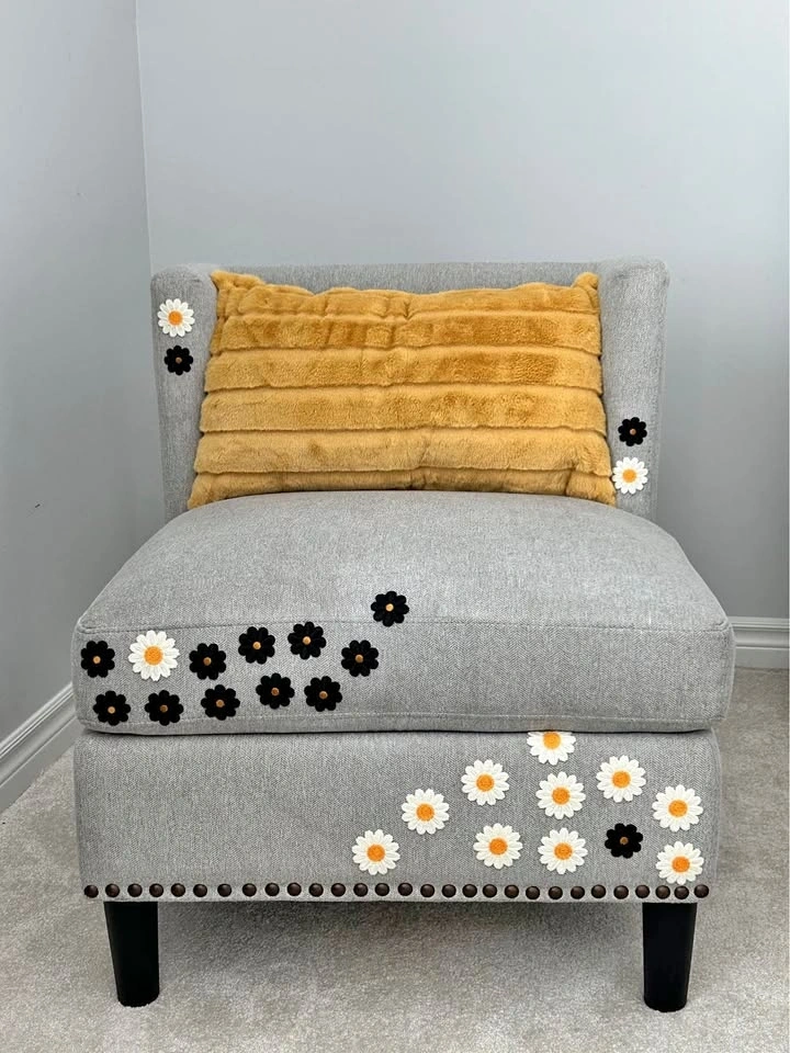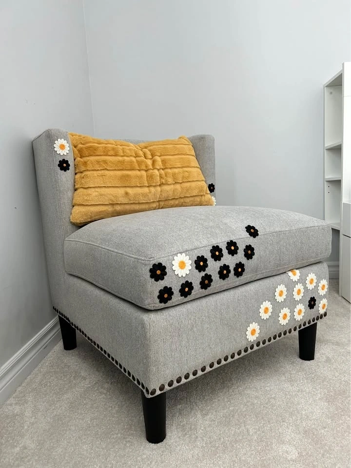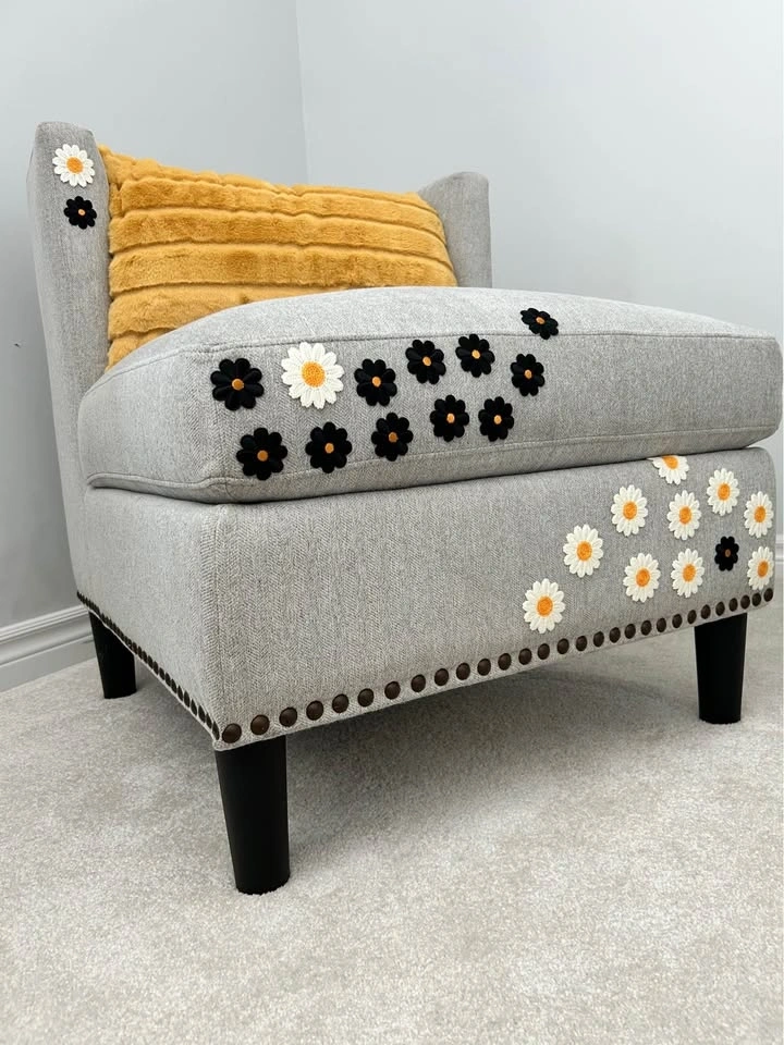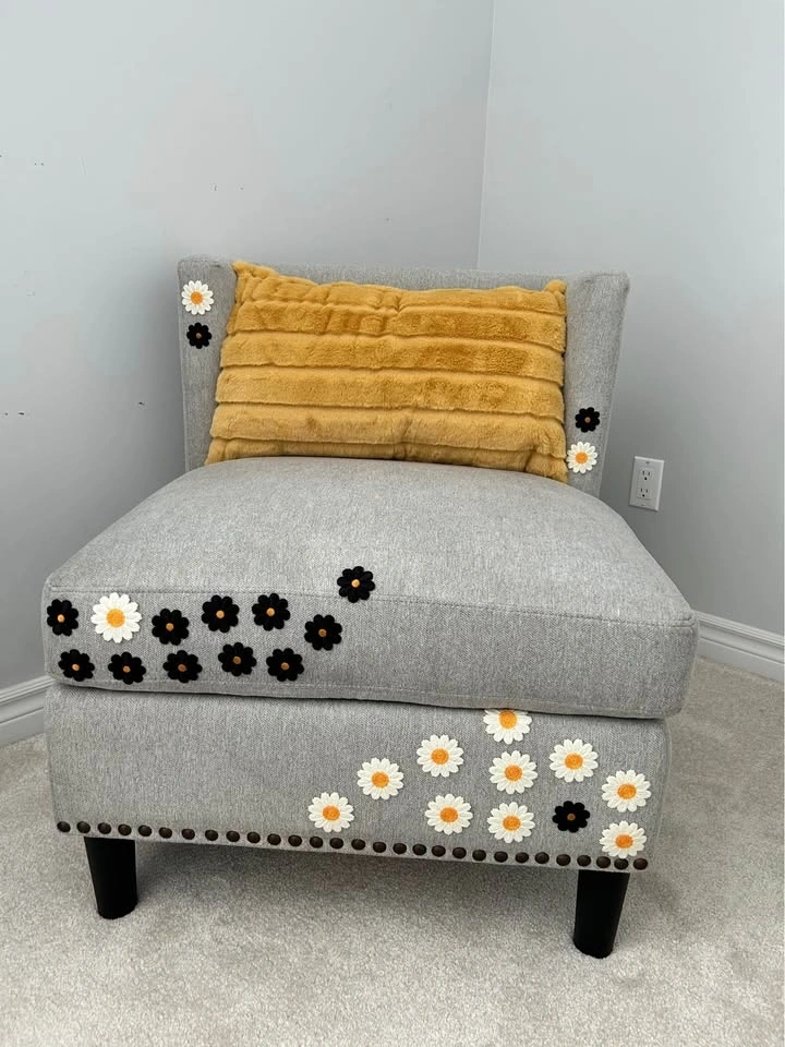 Beautiful custom accent chair with embroidered black and white floral detailing and a soft mustard accent pillow. This one-of-a-kind piece has been professionally cleaned and restored, giving it a fresh new life. Perfect for a reading corner, bedroom, nursery, or living room as a unique statement piece.