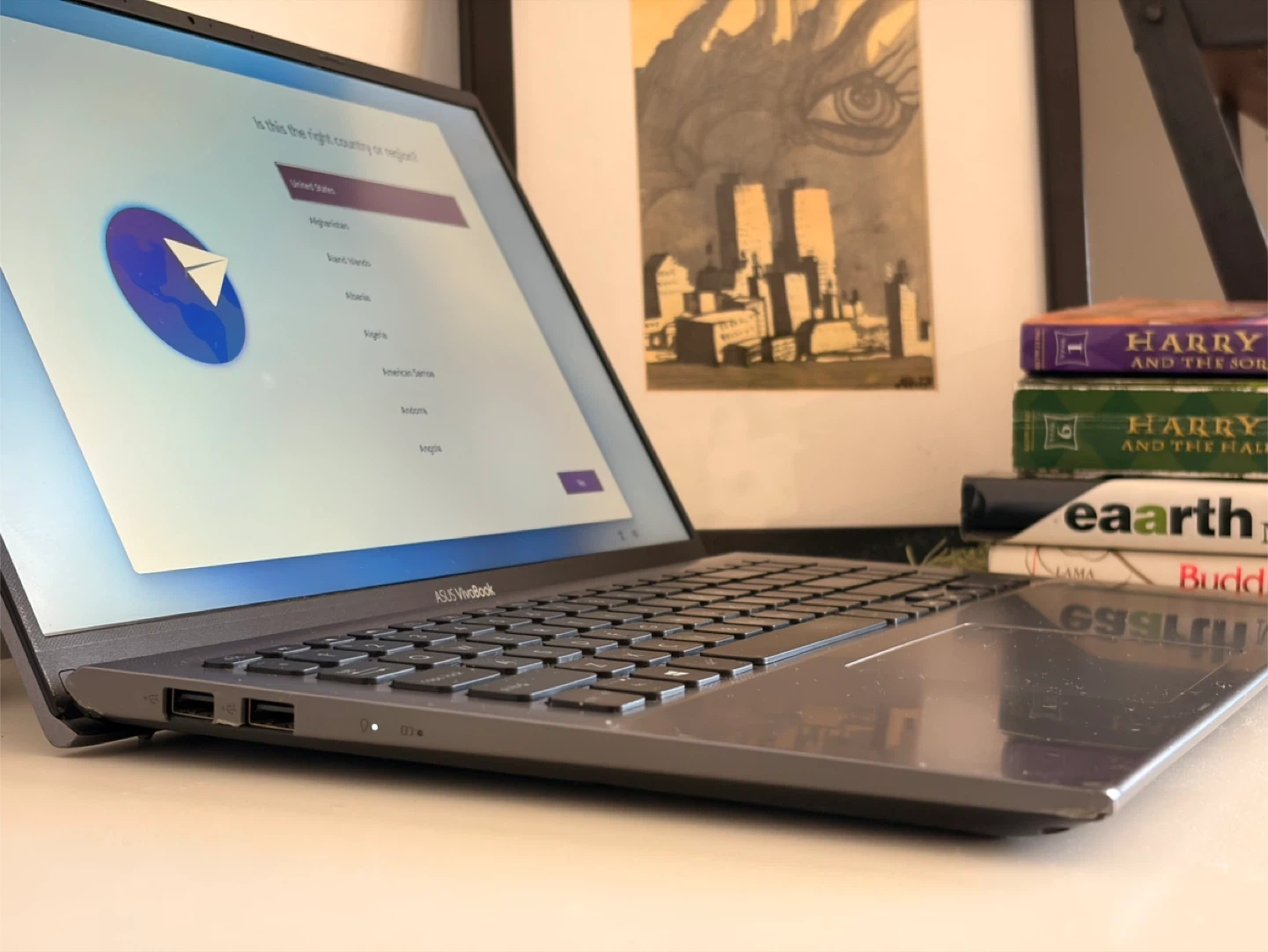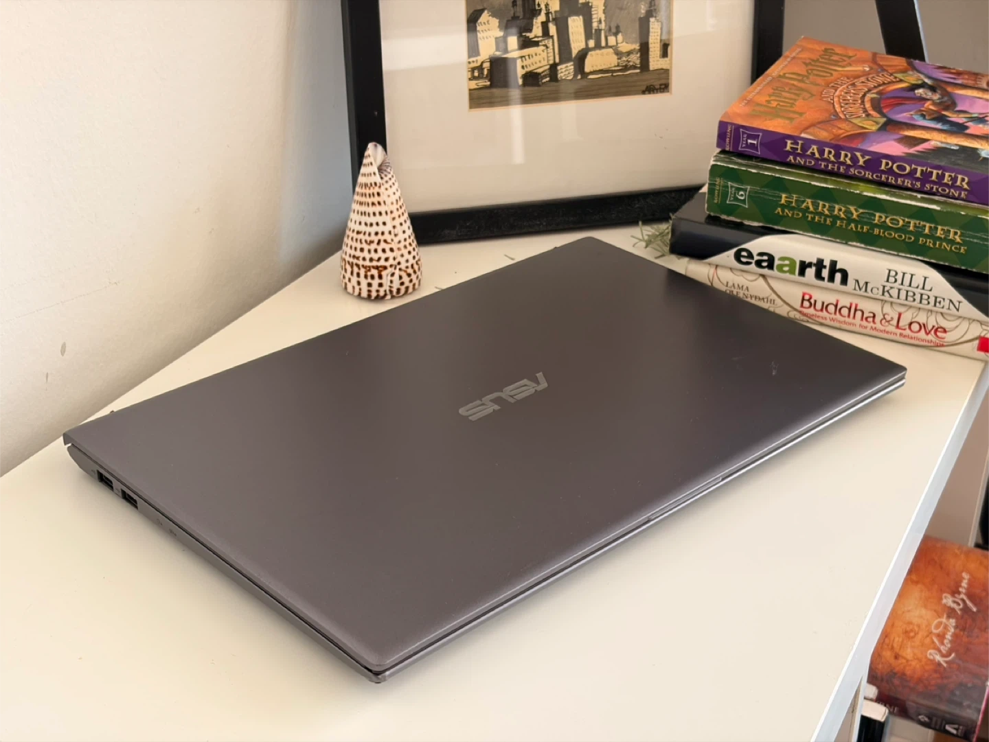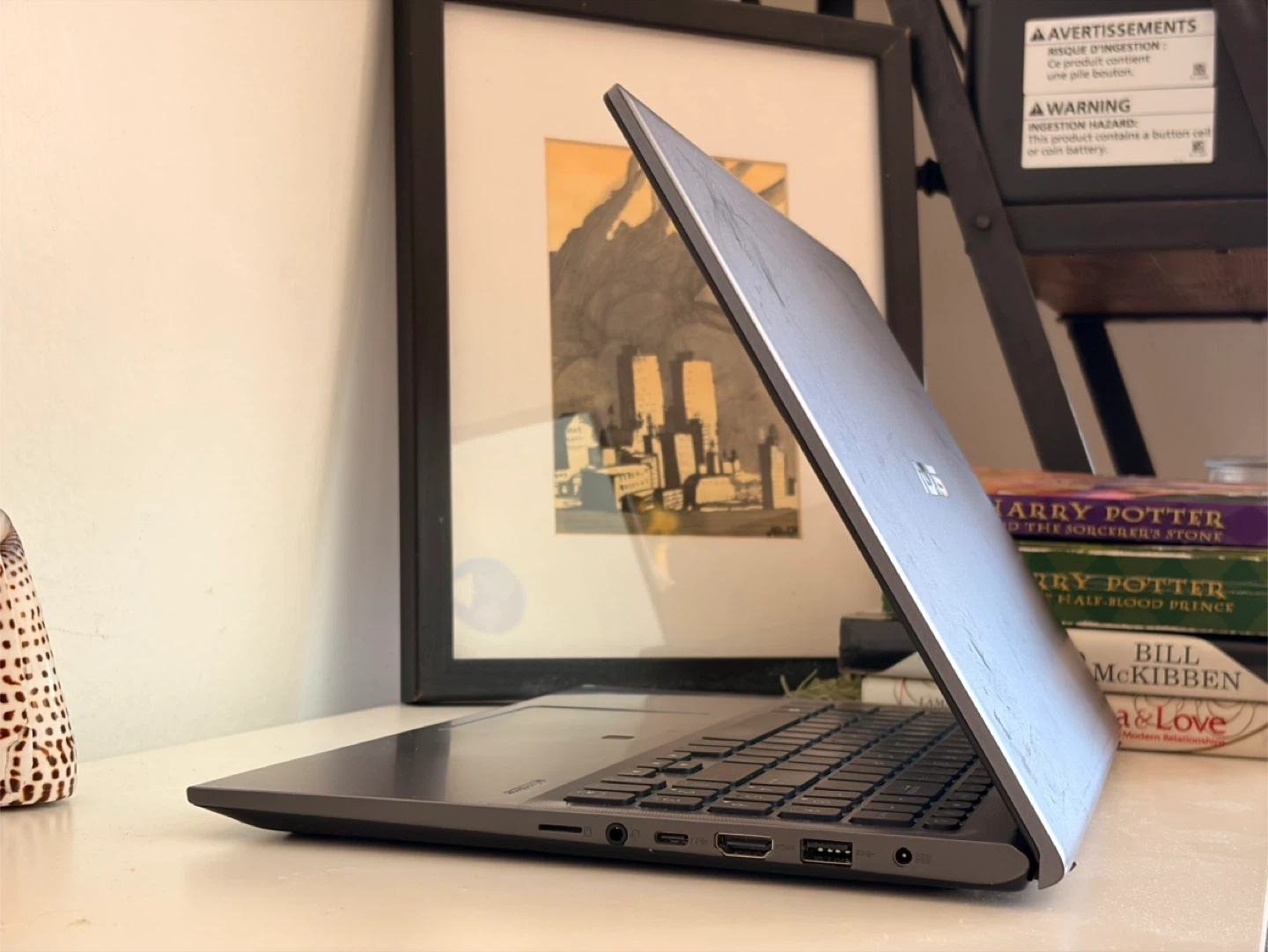 ASUS VivoBook laptop. It's a sleek gray model with a comfortable keyboard and trackpad. It features multiple USB ports, an HDMI port, and an SD card reader.