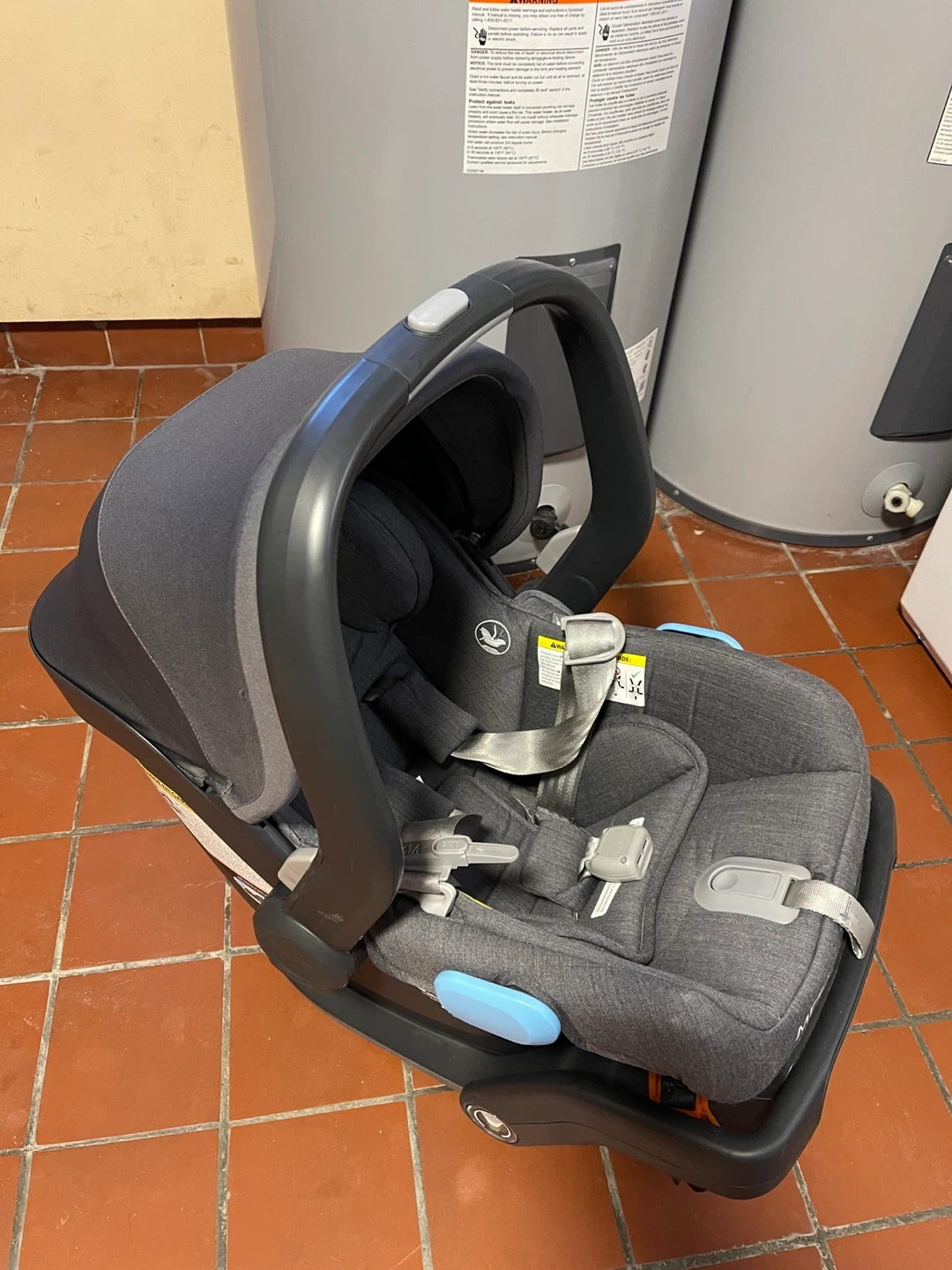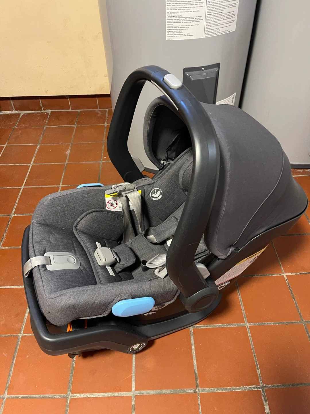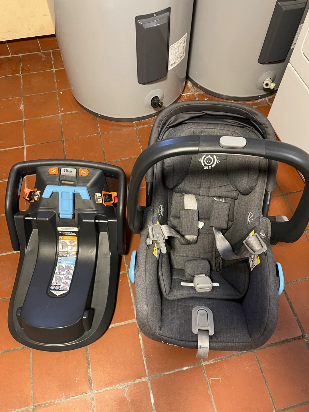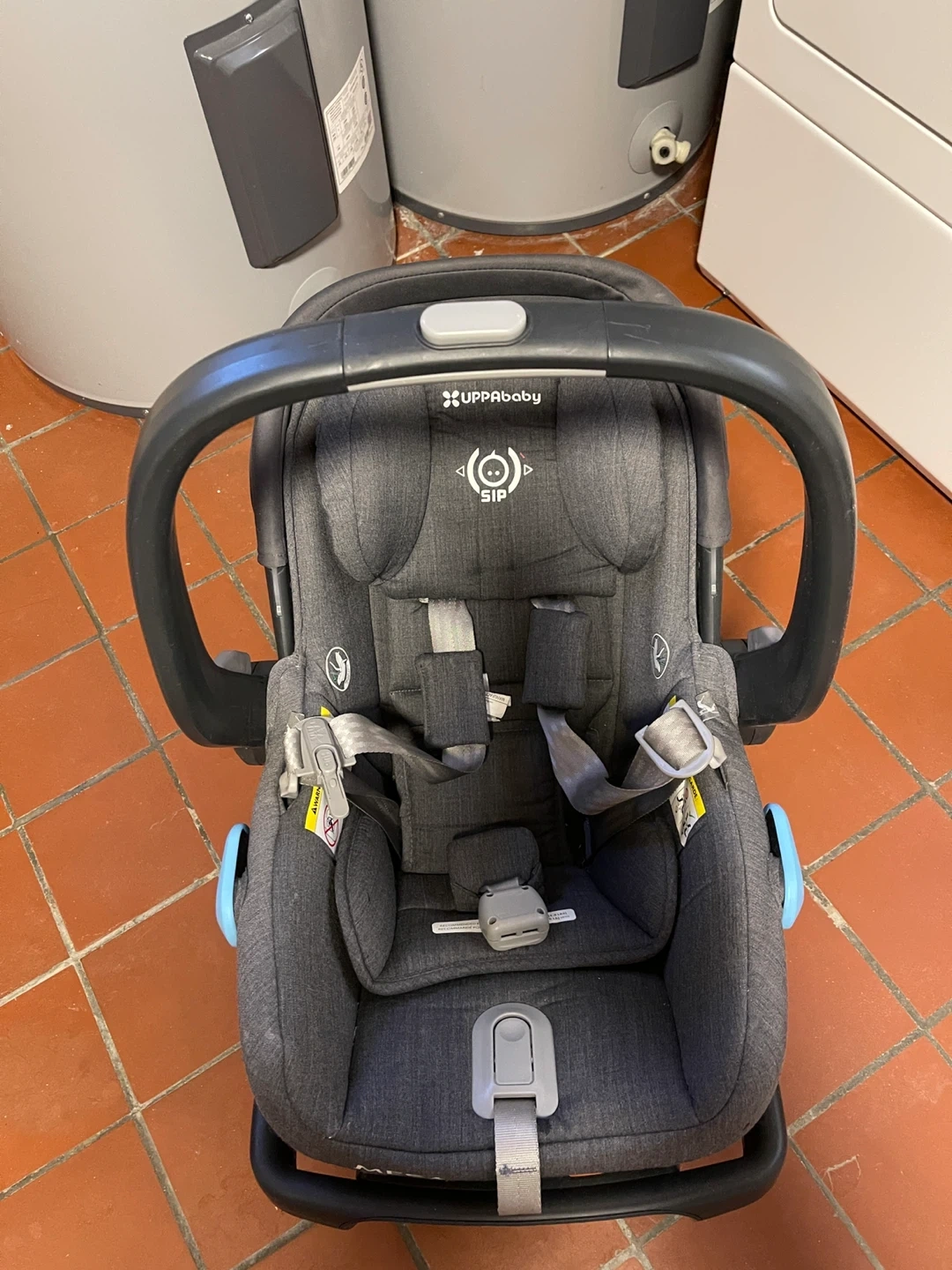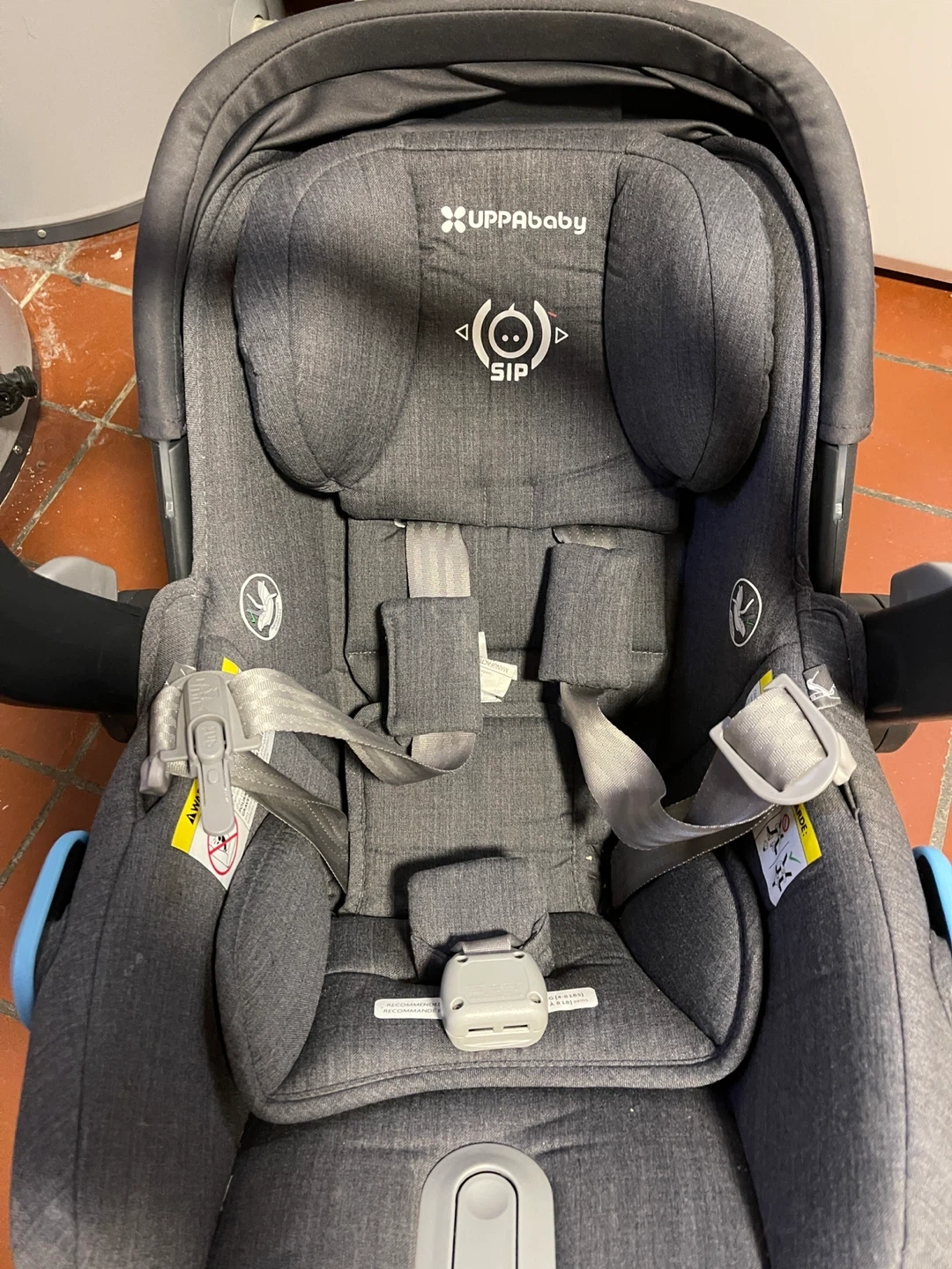 This UPPAbaby MESA infant car seat is a dark grey colour and includes the base. It's designed with SIP (Side Impact Protection) for safety. The fabric is a heathered material.