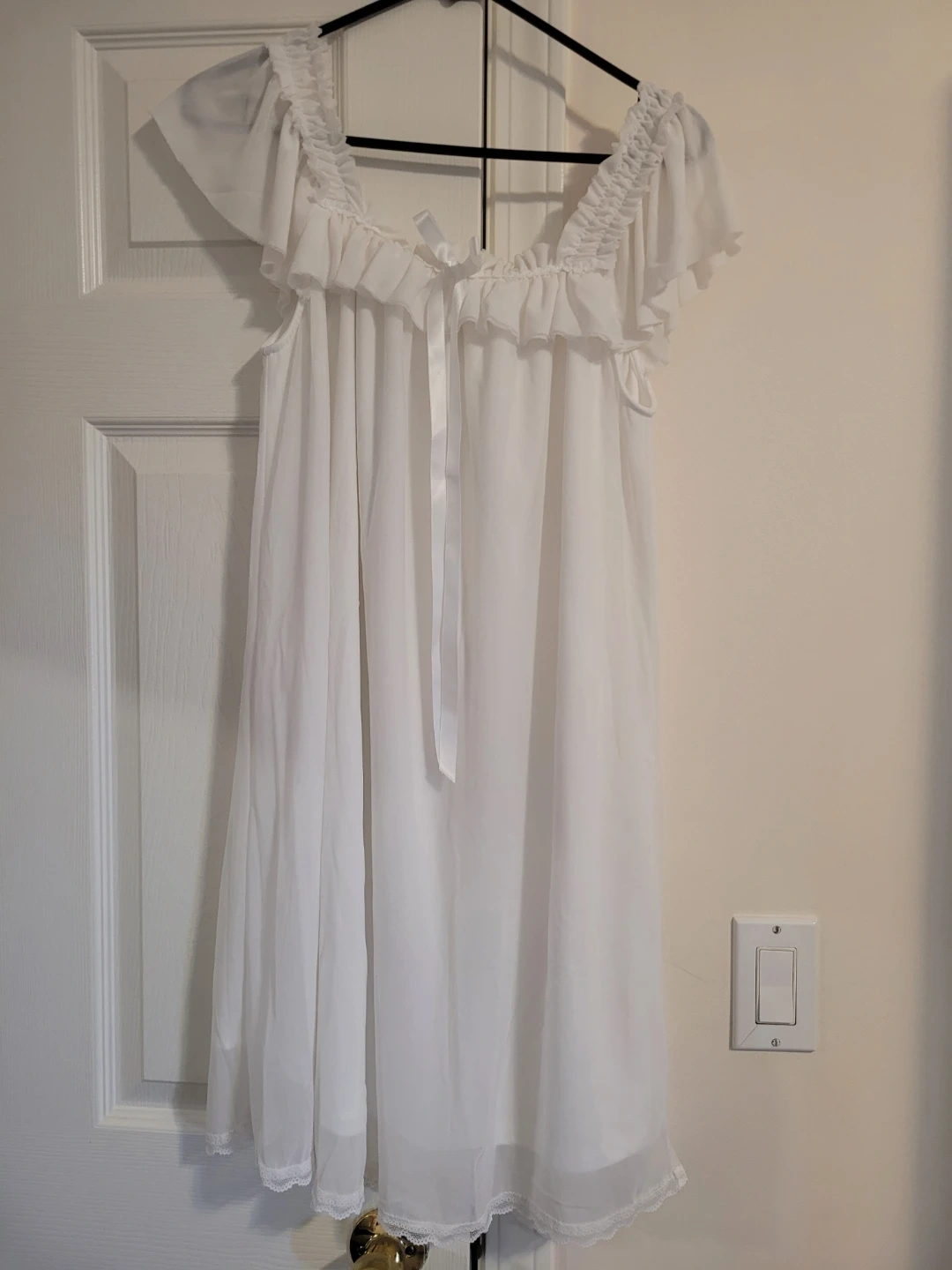 Selling a cute white nightgown! It features a ruffled neckline and short sleeves, perfect for a comfortable night's sleep. The material is soft and flowy, with a ribbon tie at the front. The bottom hem is trimmed with lace.