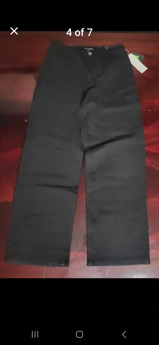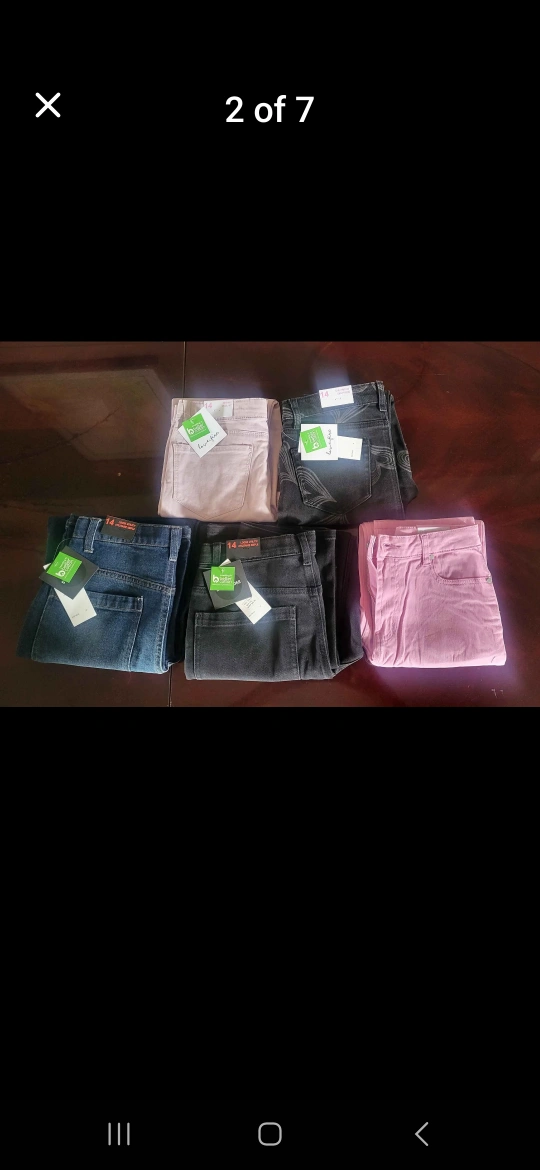 Girls' jeans, various colours and styles. Size 14. Includes dark wash, black with heart print, pink, light mauve, and carpenter style. New with tags.