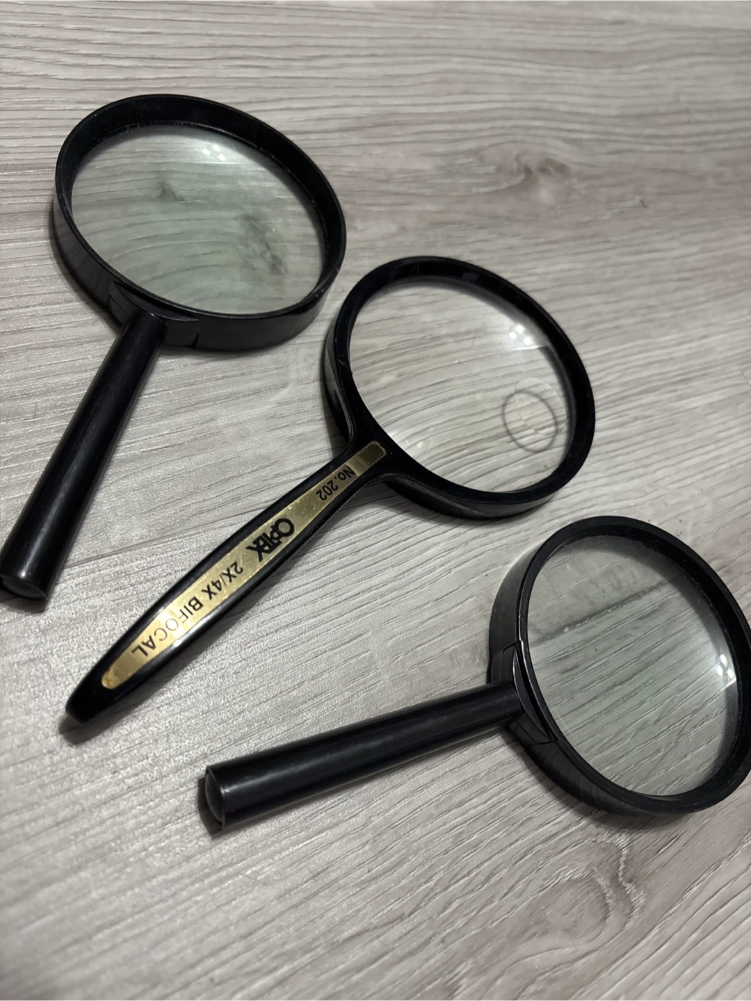 Three magnifying glasses are included. One is an Optex No. 202 model with bifocal lens. These are handy for reading small print or hobby work. Magnification is 2X and 4X.