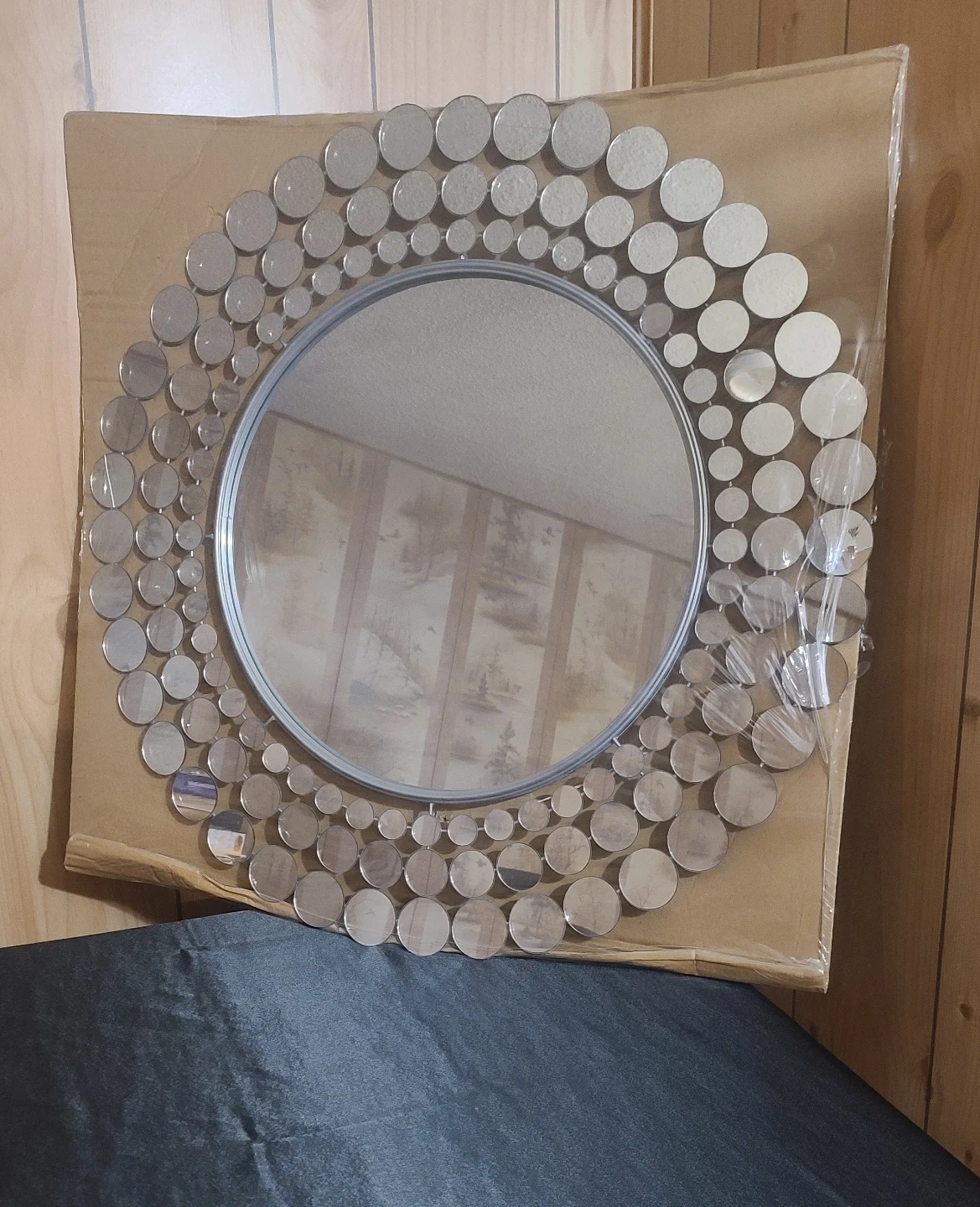 This decorative mirror has a unique circular design with many small mirrored accents around the edge. It's suitable for adding a touch of style to any room. Some of the smaller mirrored pieces may show minor chips or cracks.
