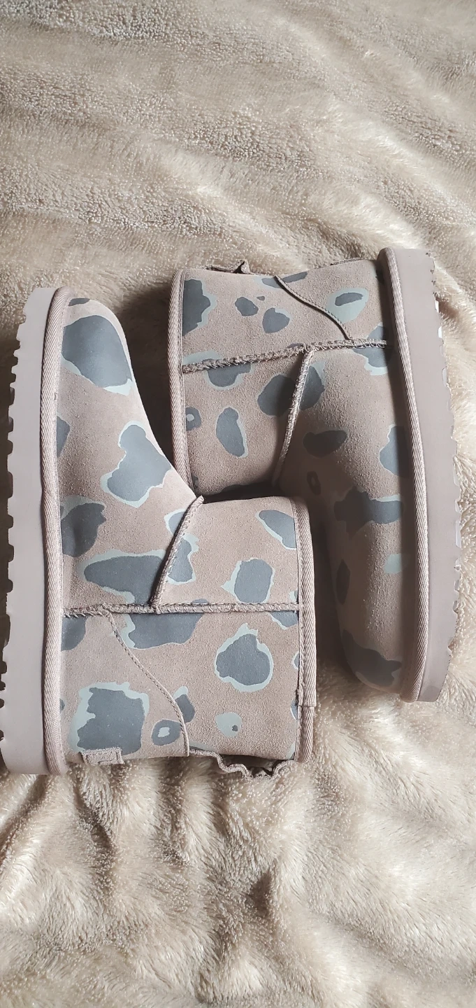 These UGG Classic Mini boots feature a cool camouflage design. They're lined with cozy sheepskin for warmth. Size is 7 US women's Brand new never worn.