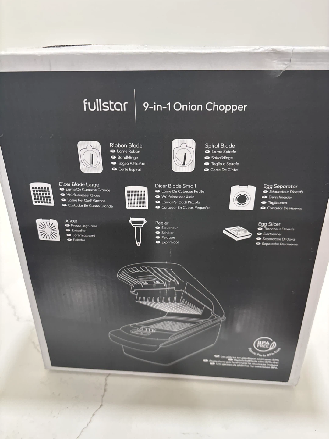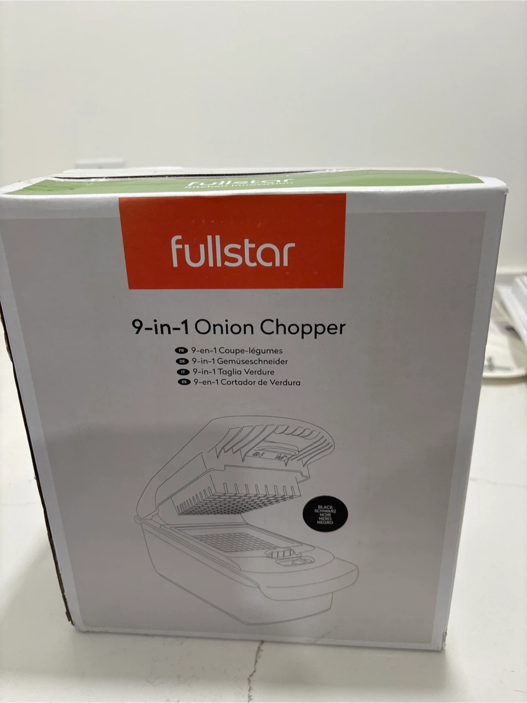 This Fullstar 9-in-1 Onion Chopper is a versatile kitchen tool for chopping vegetables and more. It includes various blades for dicing, slicing, and separating. BPA-free parts. New in the box.