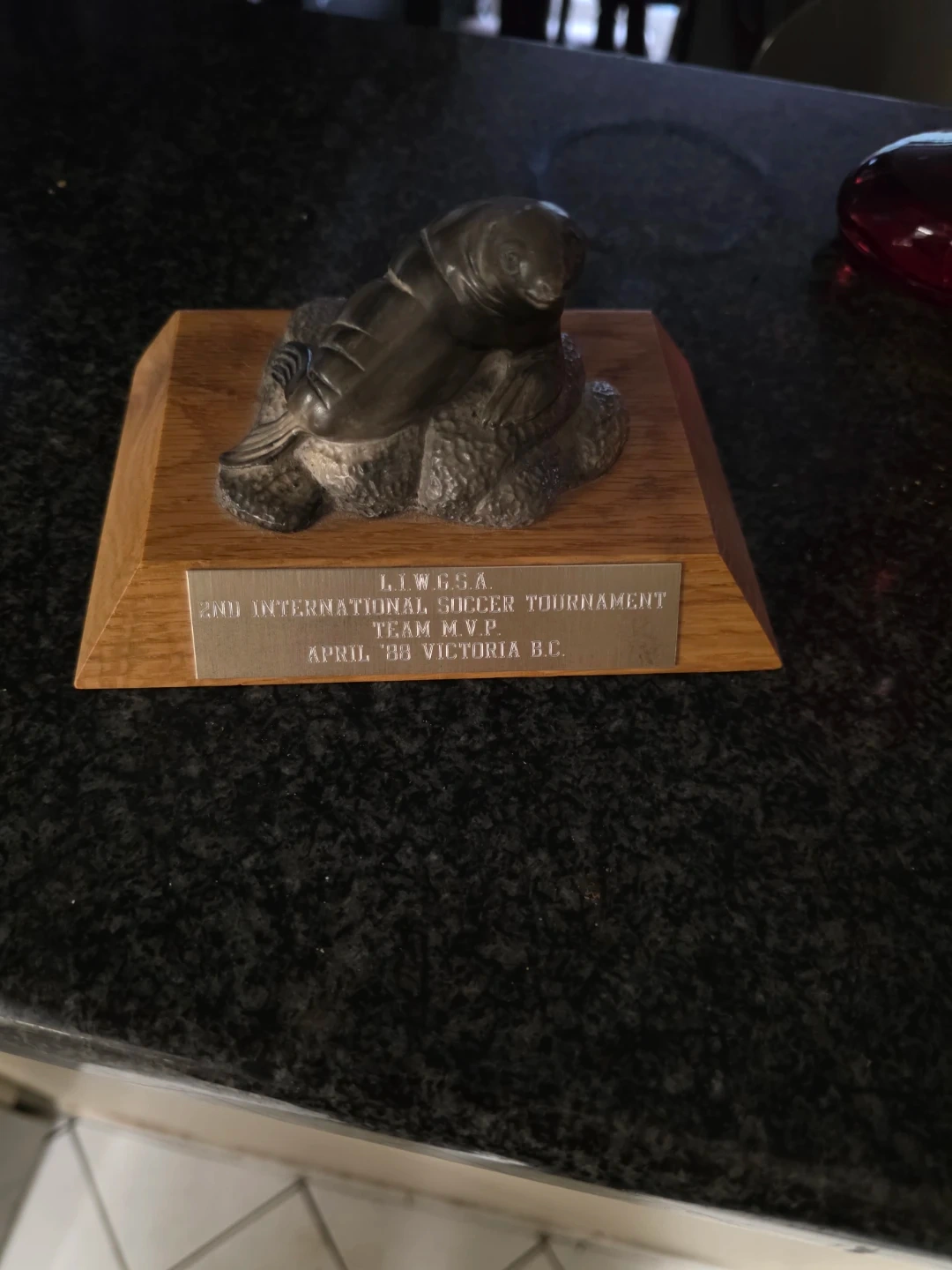 Trophy from the 2nd International Soccer Tournament for Team MVP, awarded in April '88 in Victoria B.C. It's a sculpture of a seal on a wooden base.