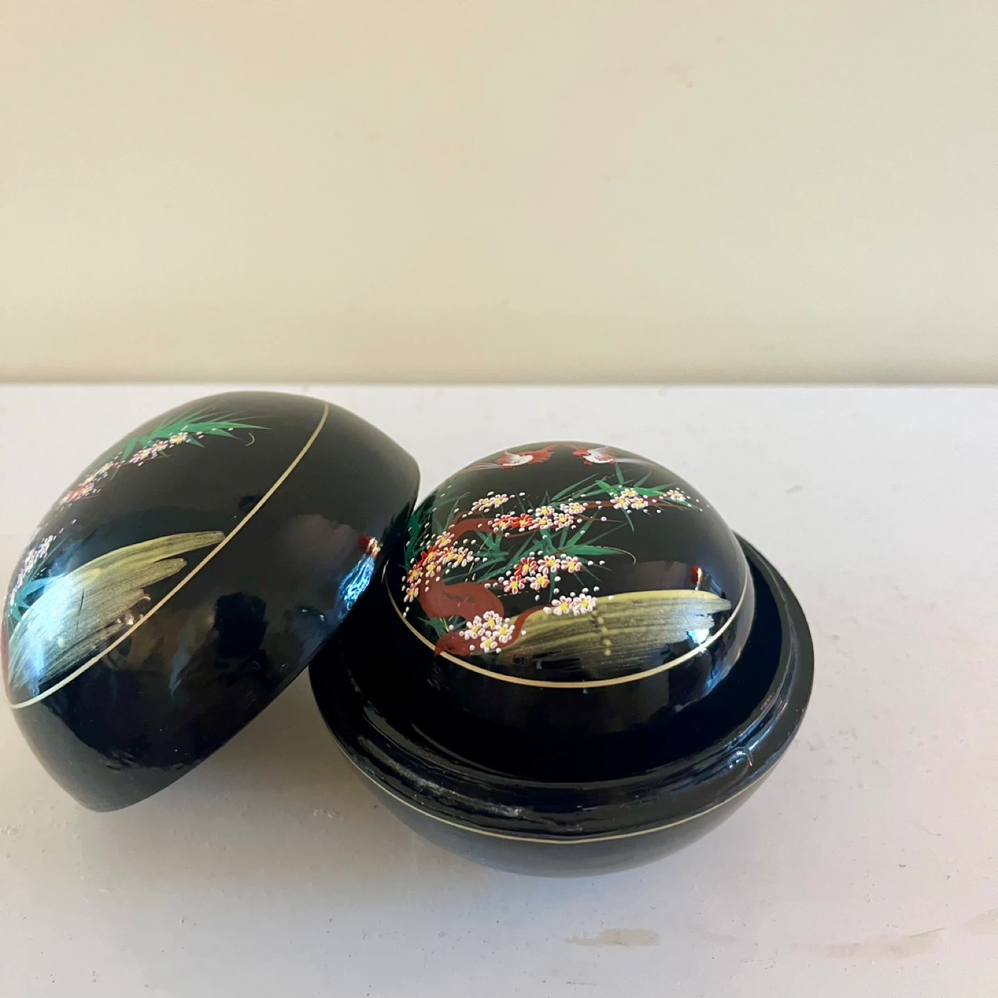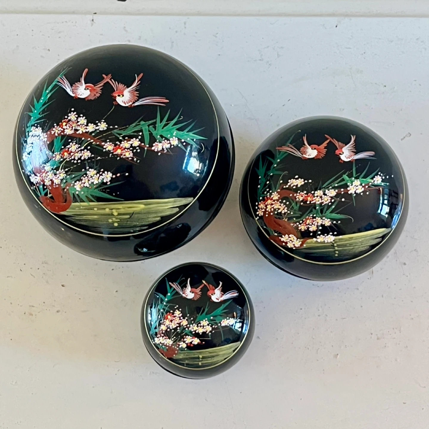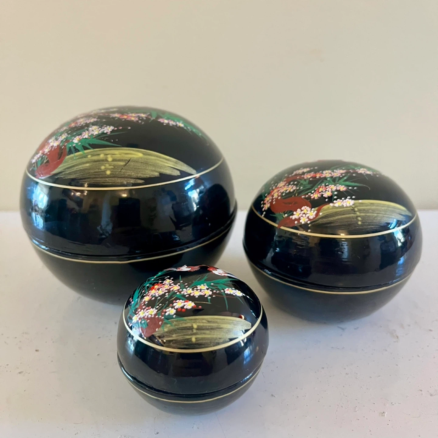 3 hand-painted nesting lacquer boxes in good vintage condition. The set includes three spherical boxes that nest within each other, each adorned with traditional Japanese art, showcasing birds and cherry blossoms.