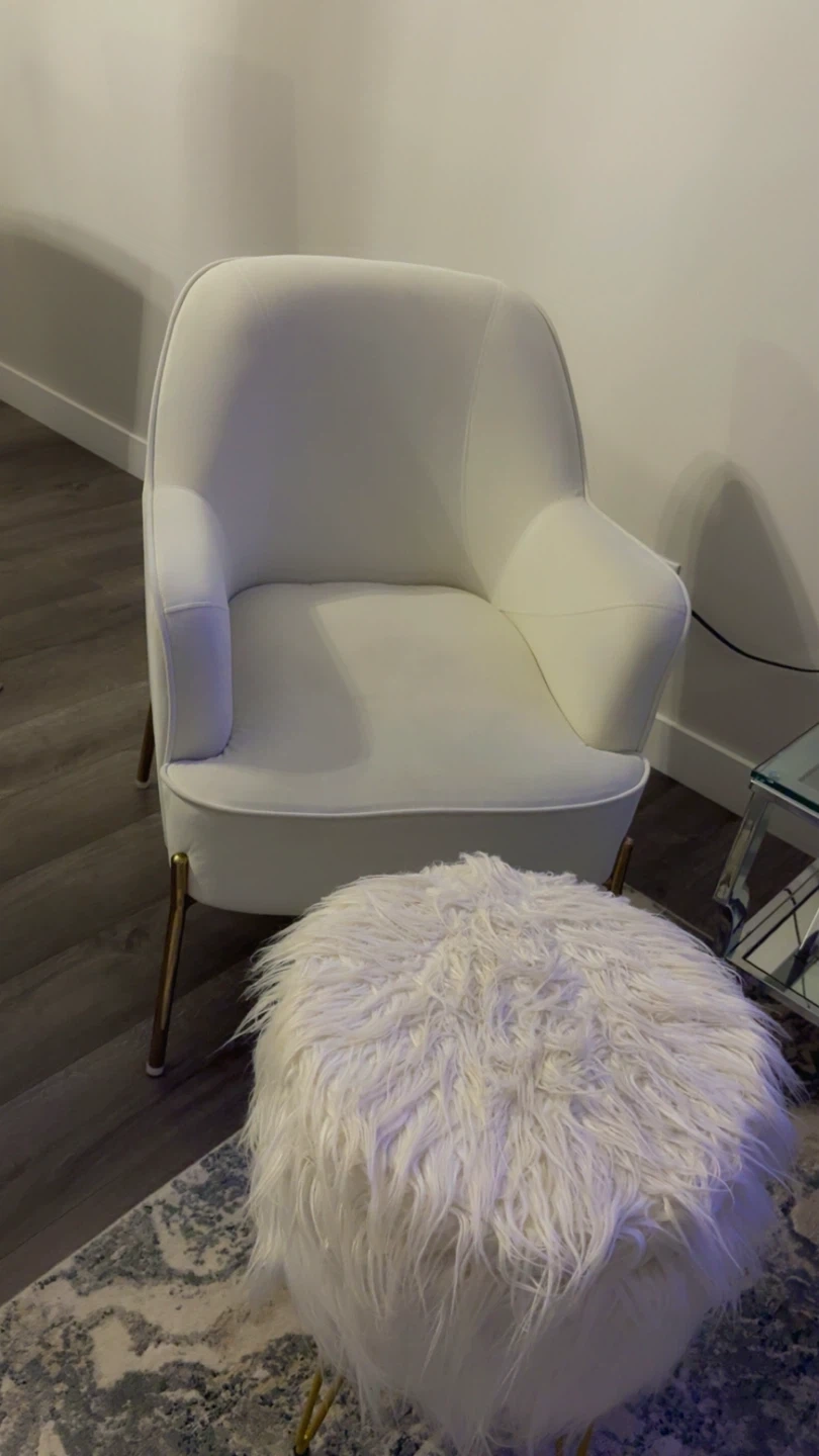 Stylish white accent chair and matching fluffy ottoman. Features gold-toned legs for a modern touch. Adds a cozy vibe to any room!