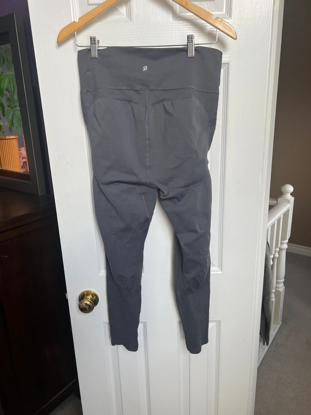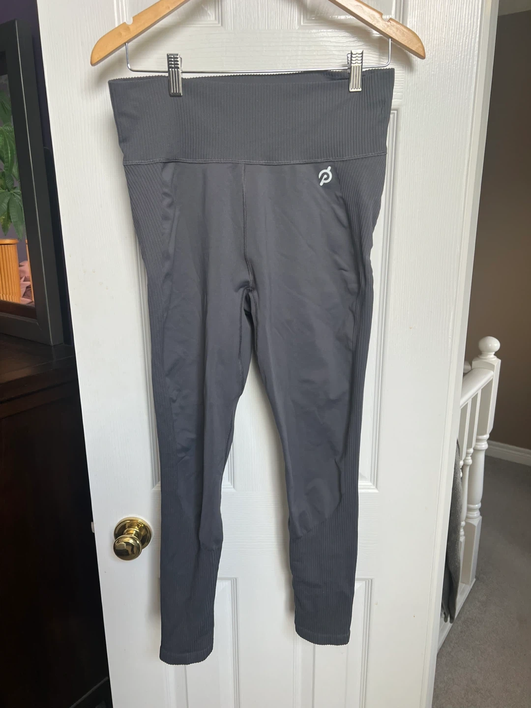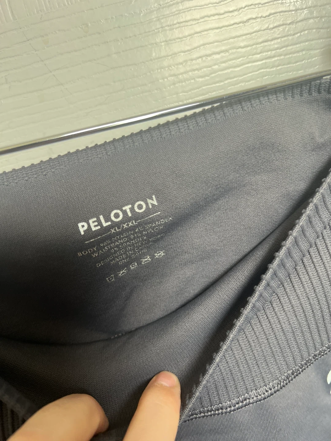 These Peloton leggings are grey and size XL/XXL. They're made of 81% nylon and 19% spandex. Great for workouts or casual wear!