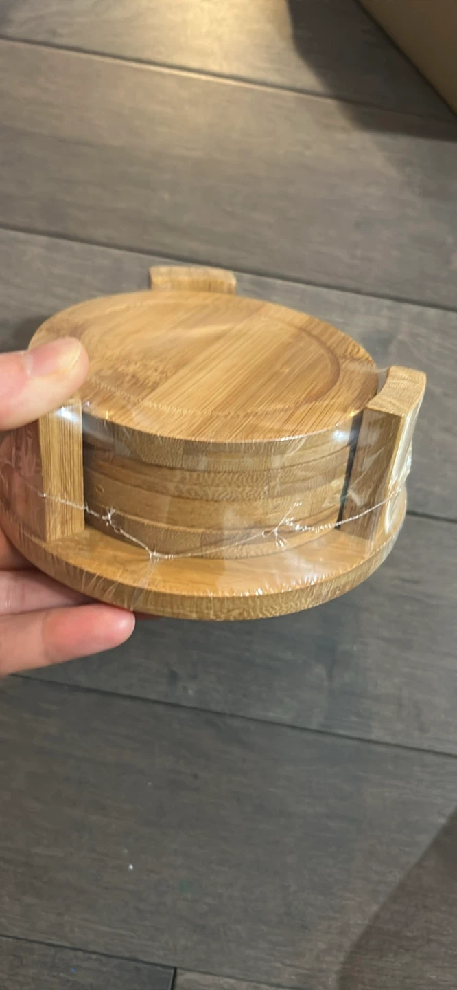 Selling a brand new set of bamboo coasters with a holder. The set includes four bamboo coasters and a bamboo holder. They're still in their original packaging and ready to protect your tables!