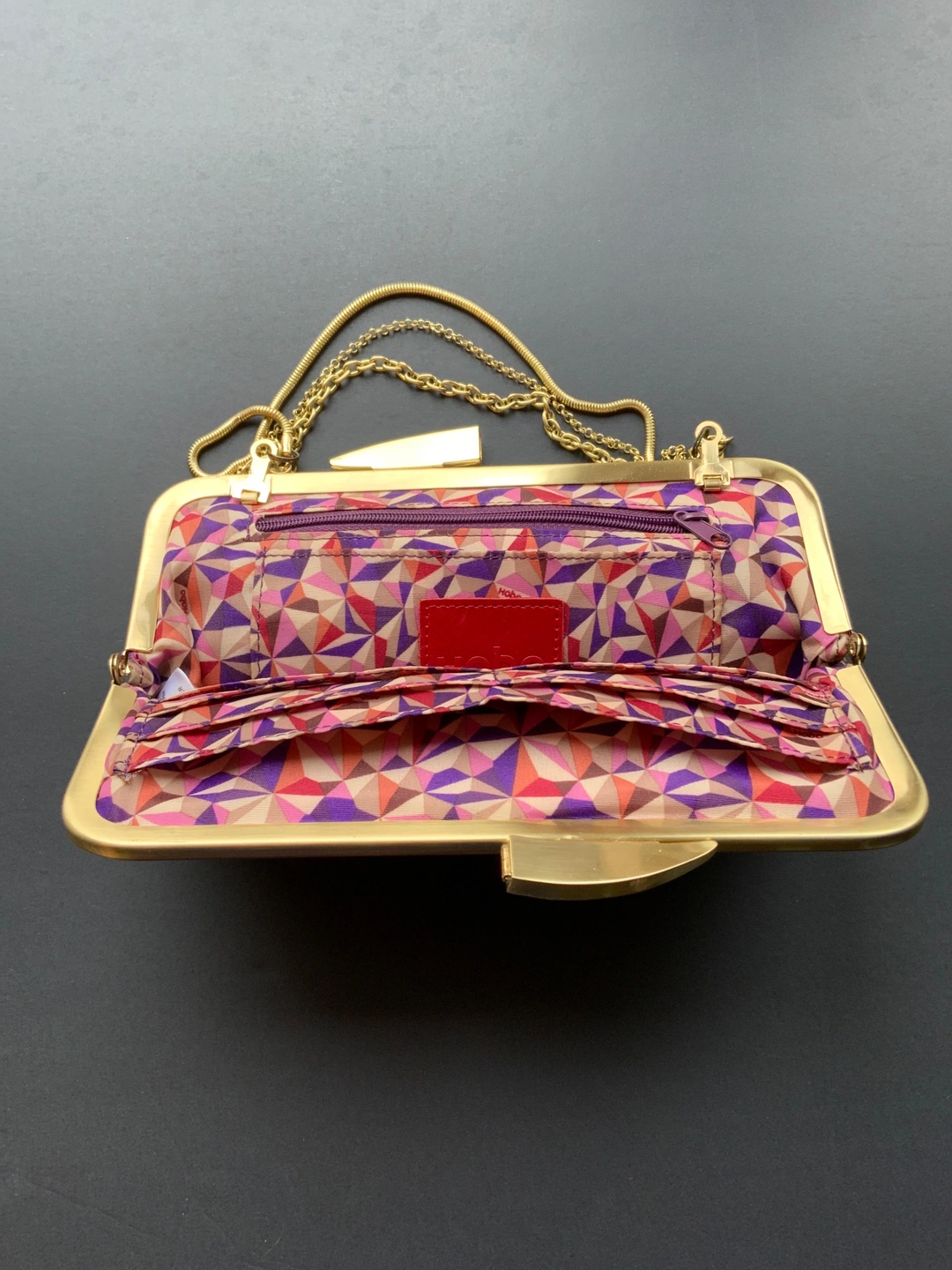 A beautiful accessory for an evening out. In mint condition. Neutral. Complements anything. Hold it in your hand or carry it with the stunning gold accent straps. BOHO. Genuine leather. Polyester interior.
