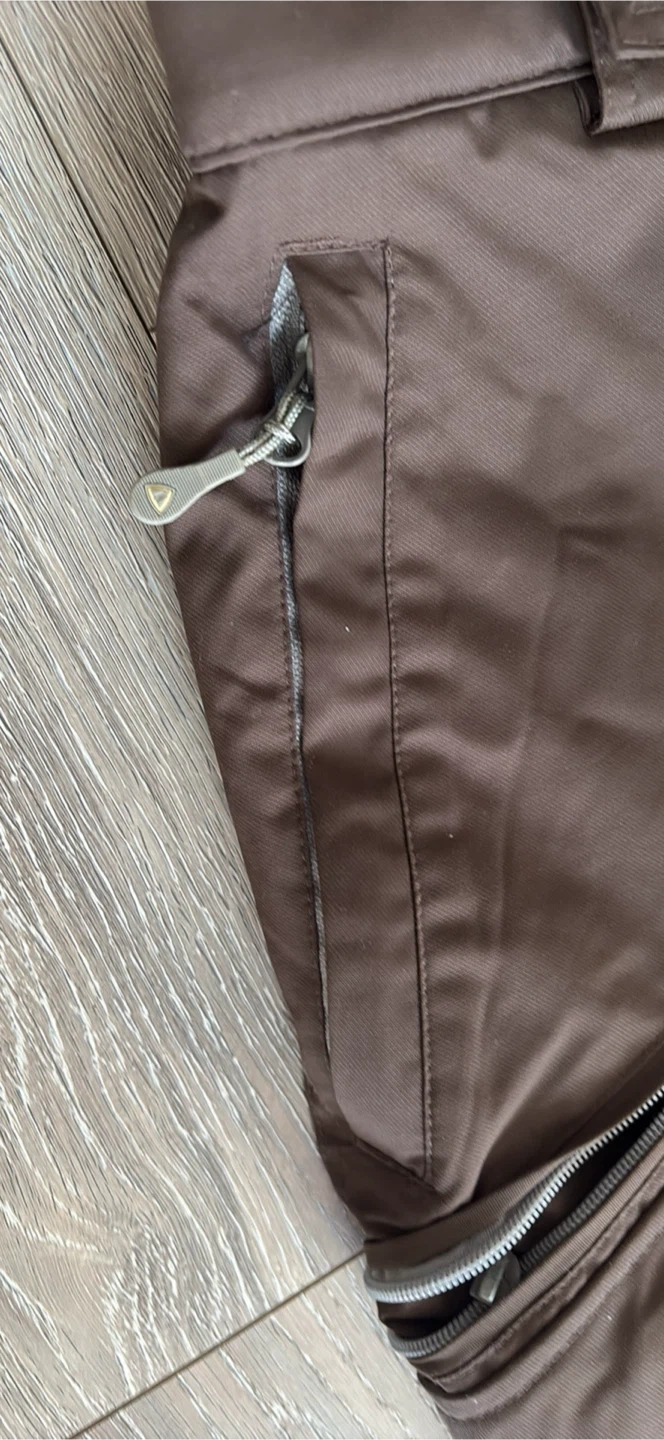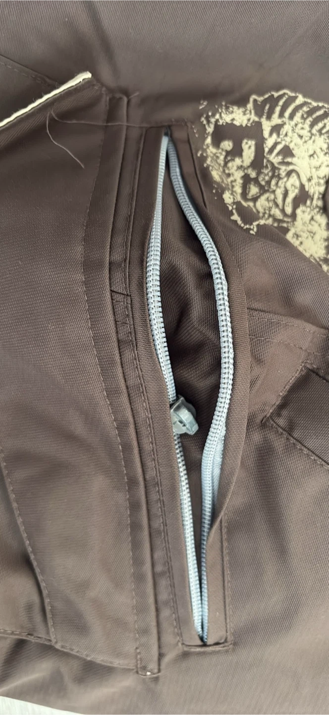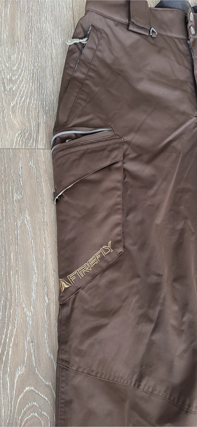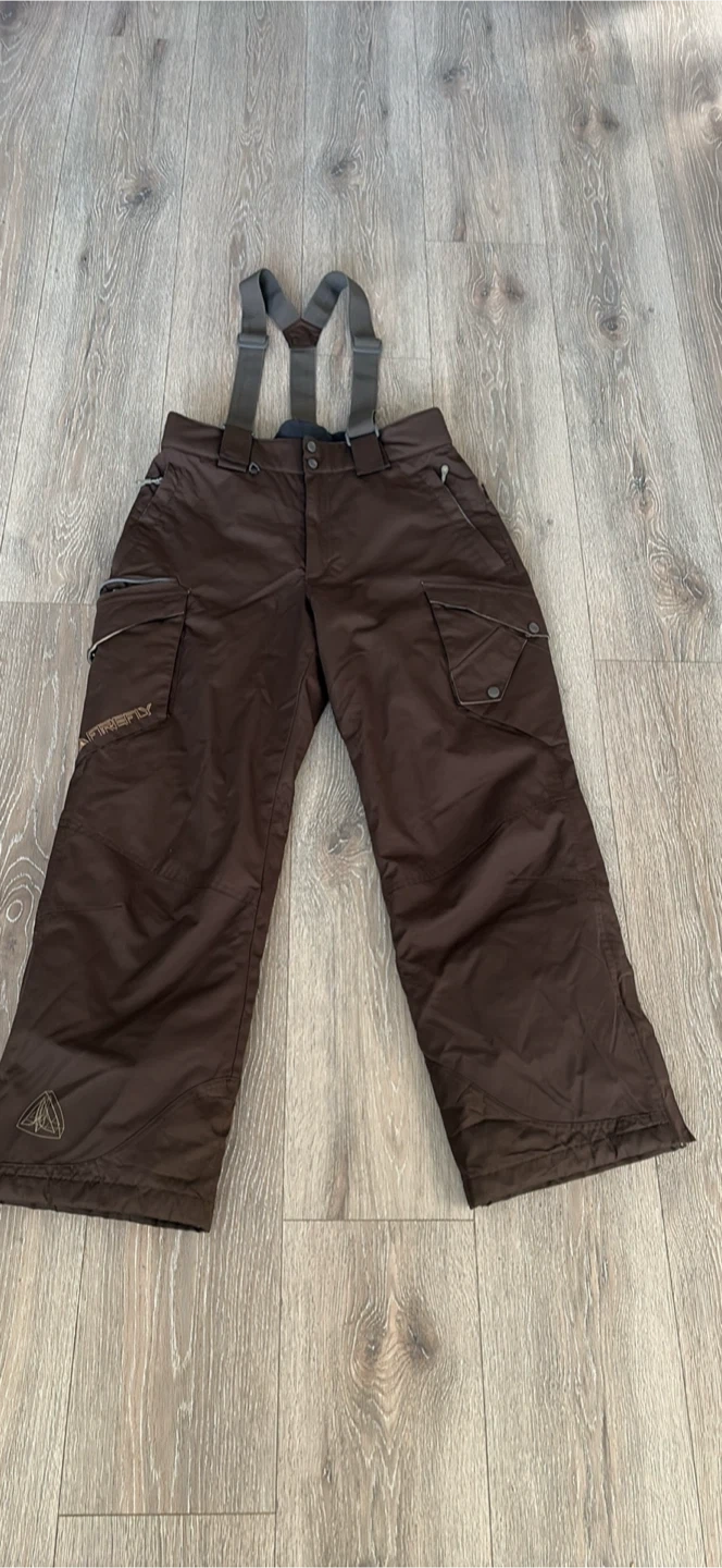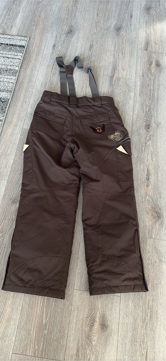 Brown snow pants with adjustable suspenders and multiple zippered pockets. They're made for the outdoors. Great for keeping warm on the slopes! Excellent for go to sky at Grouse Mountain pick up walnut grove Langley at the last pictures is one zipper is broken is Not affect the performens size S