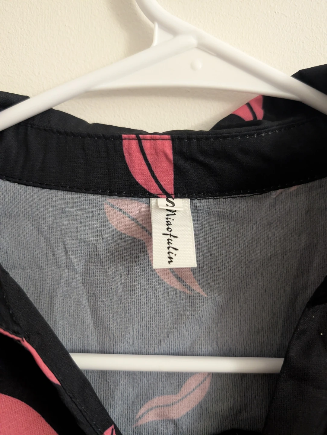 This black blouse features a fun pink lips print all over. It's a button-up style with a collar. Made from a lightweight fabric, it's perfect for adding a playful touch to your outfit!