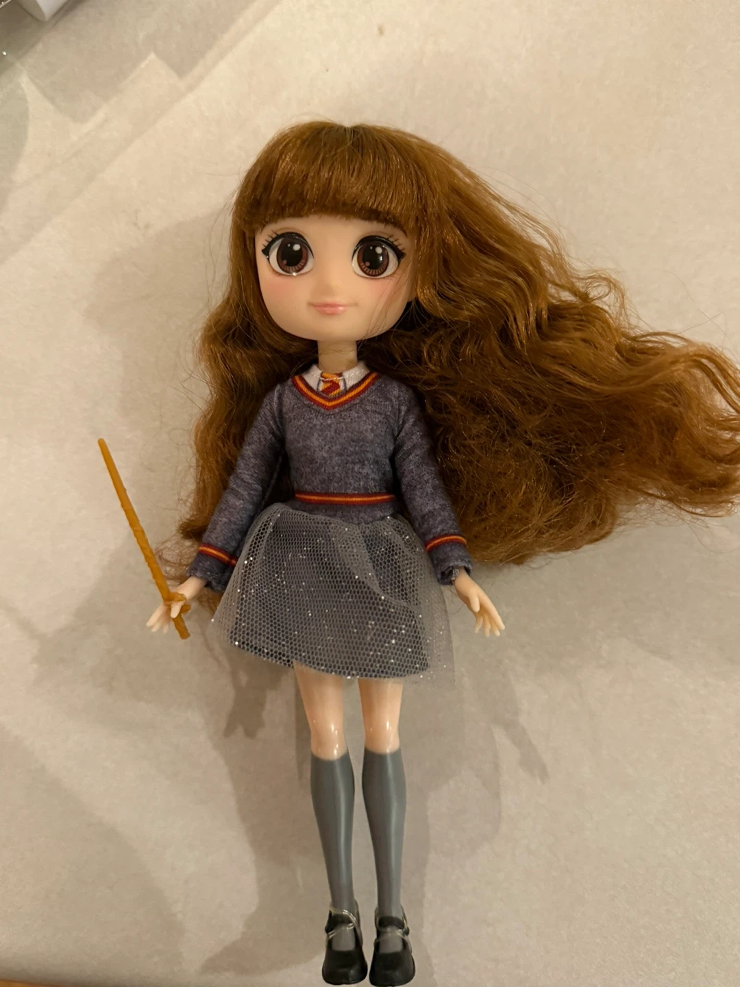 This is a Hermione Granger doll dressed in her Hogwarts uniform. She comes with a wand. Doll's skirt is made of sparkly grey tulle.
