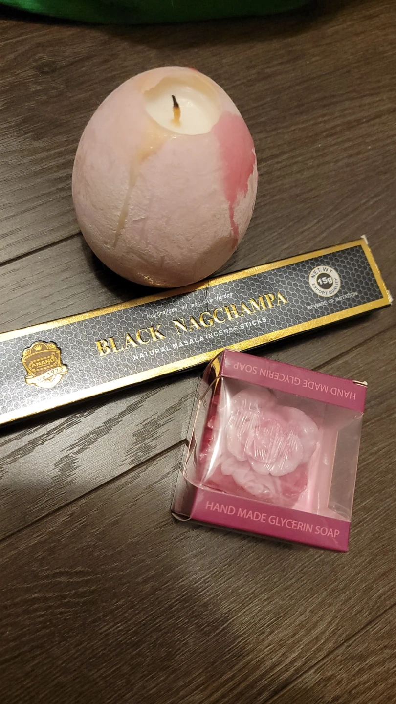 This pack contains Anand Black Nag Champa natural masala incense sticks. Brand new Rose of Bulgaria rose soap with rose water & pink candle for your pampering needs ๐