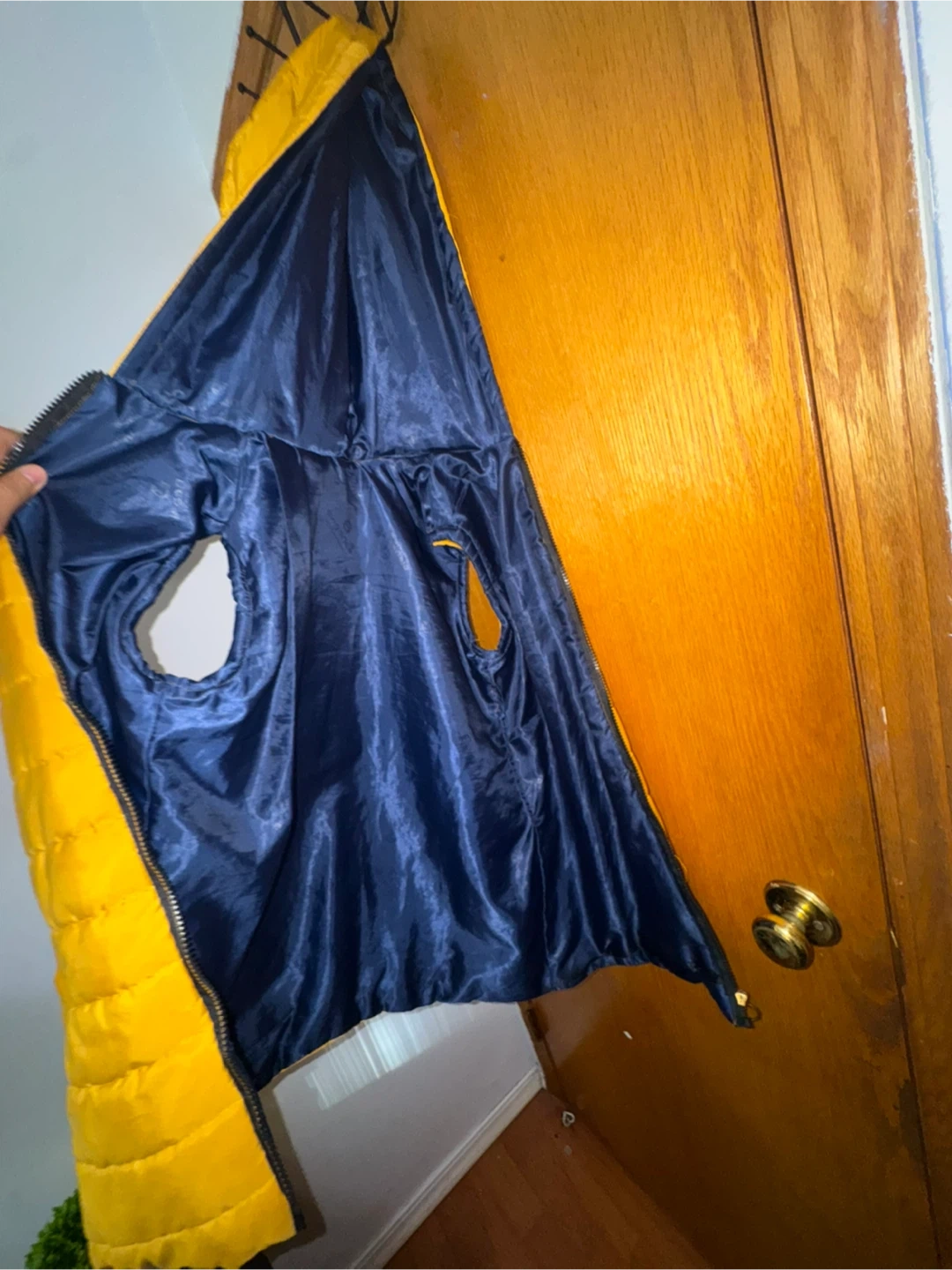 This is a yellow puffer vest with a navy blue lining. It's sleeveless and features a zipper closure. The vest is quilted for warmth.