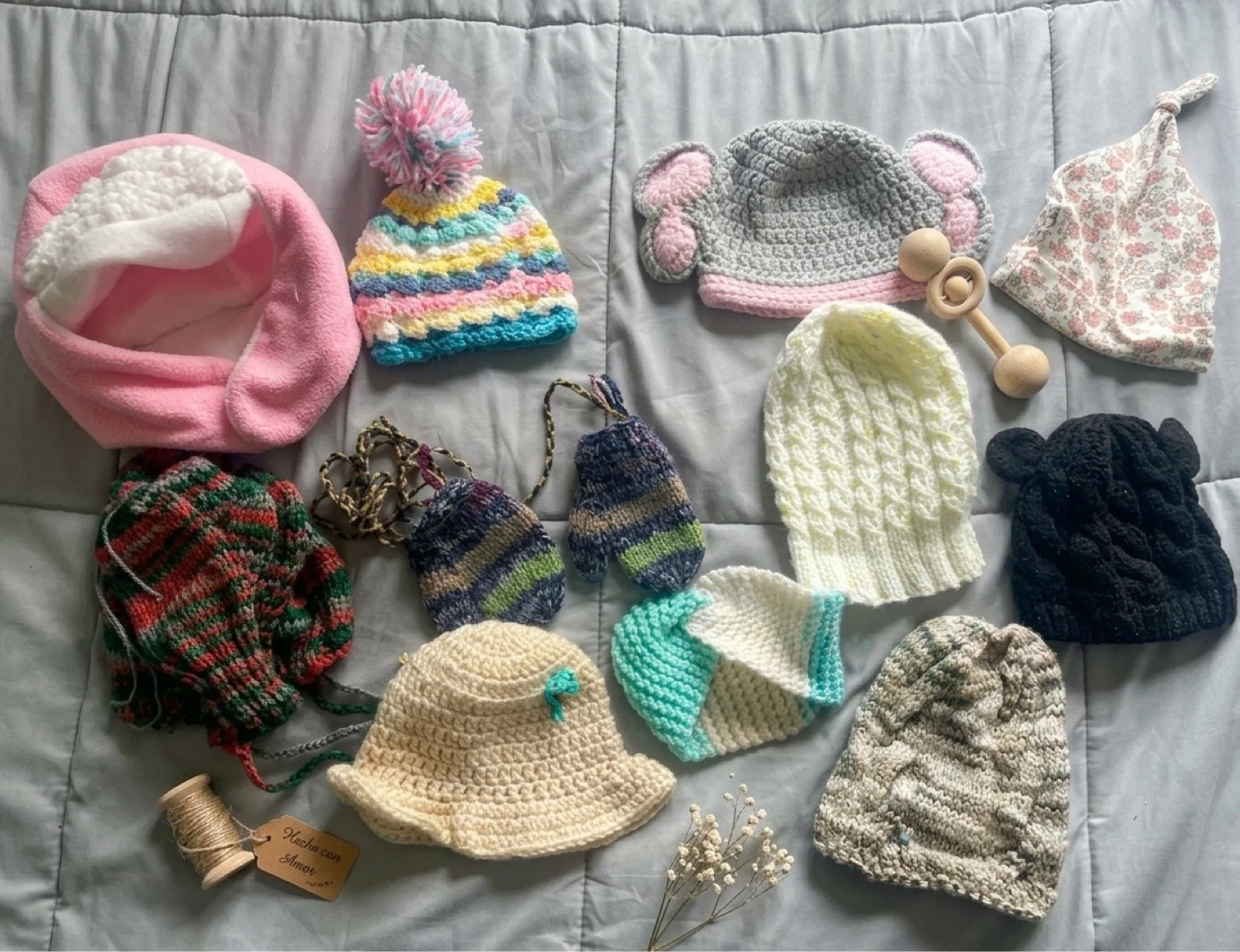 A collection of 10 assorted baby hats and mittens, including knitted and fleece styles. These are handcrafted items, perfect for keeping little ones warm. Sizes vary, suitable for infants.