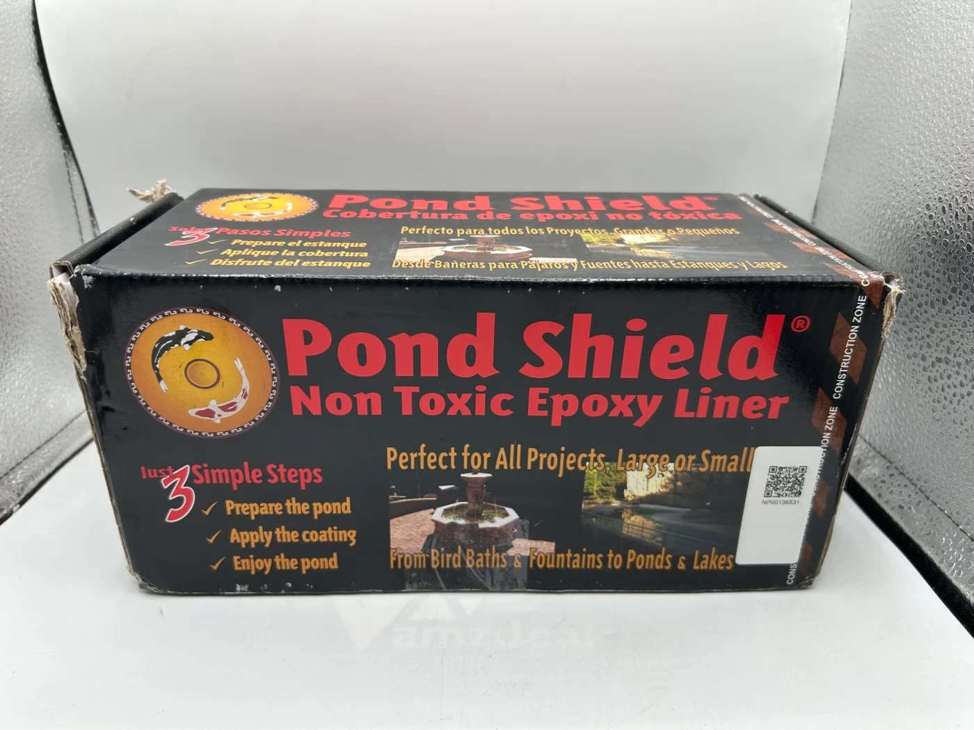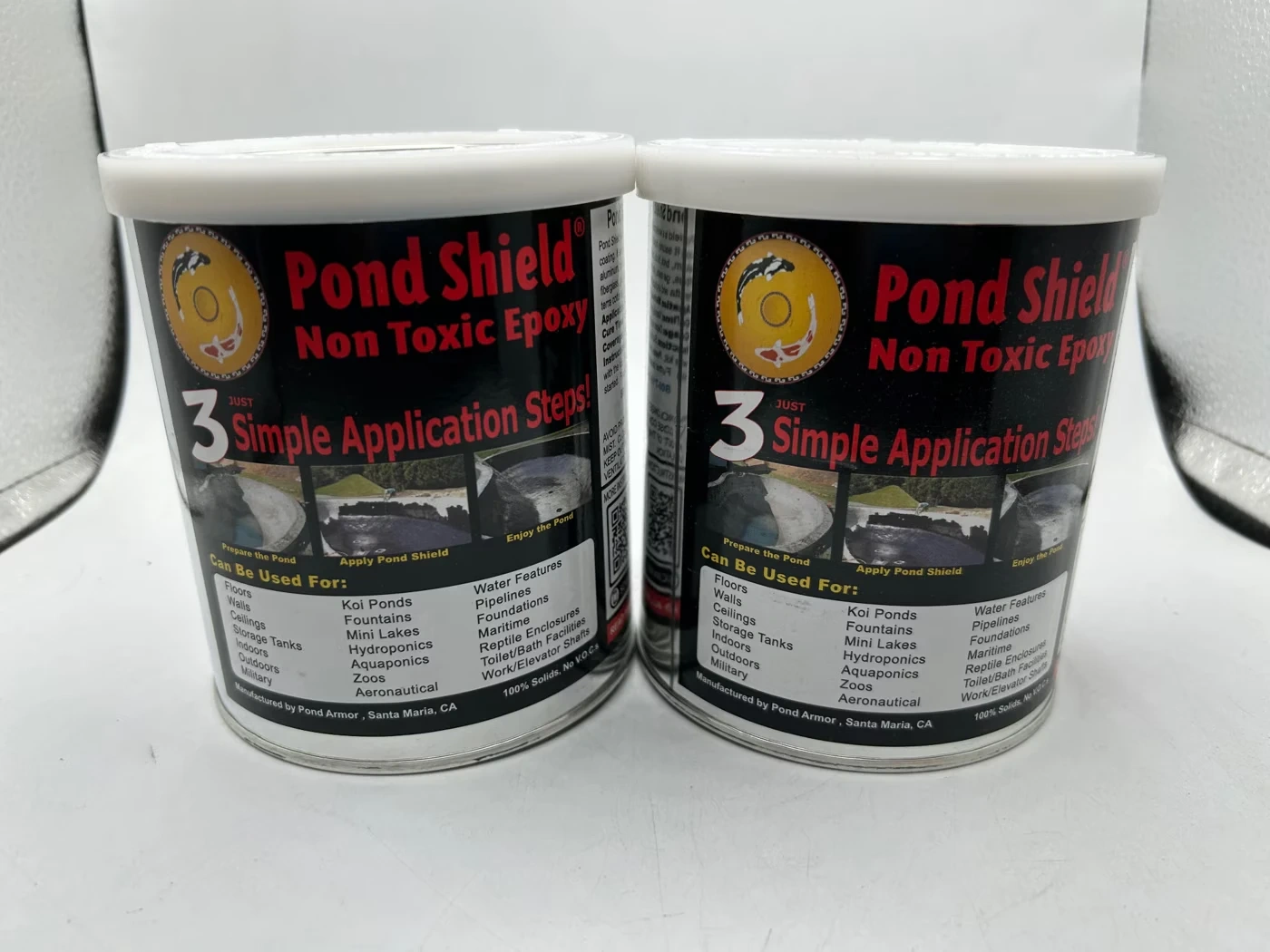 Two cans of Pond Shield Non-Toxic Epoxy Liner. It's perfect for all projects, large or small, from bird baths and fountains to ponds and lakes. This epoxy liner is easy to apply in just 3 simple steps.