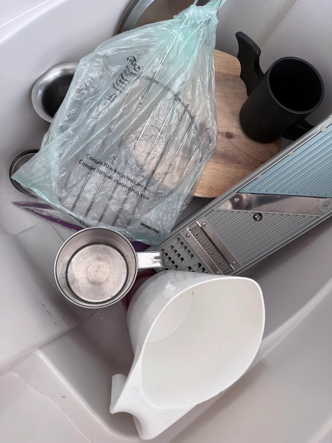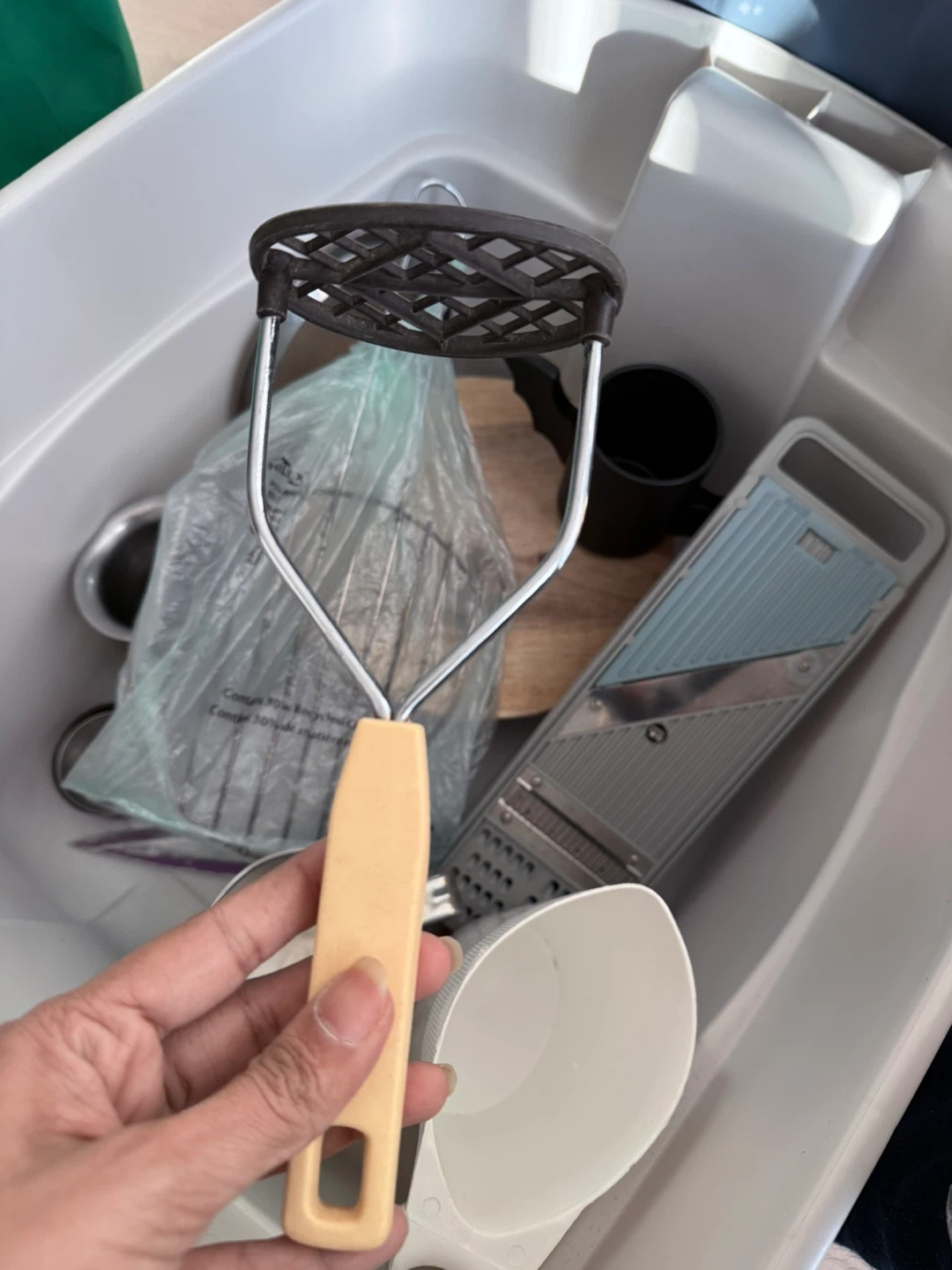A collection of kitchen tools including a mandoline slicer, masher, cutting board, and measuring cups. These items are handy for food preparation. Useful for anyone who does a lot of cooking or baking!