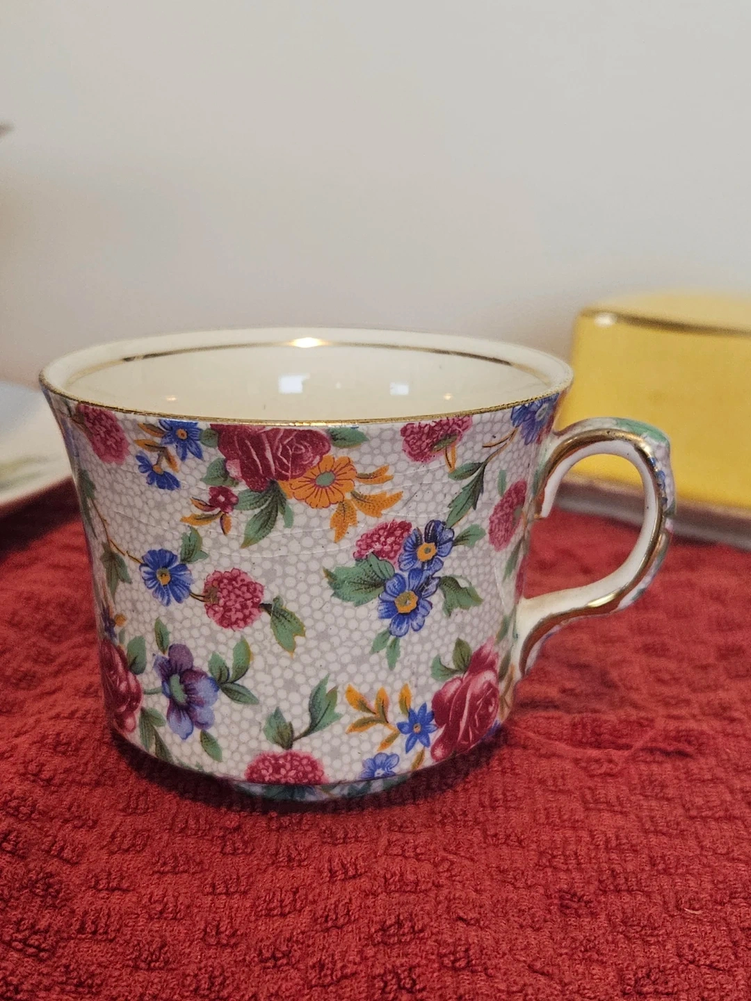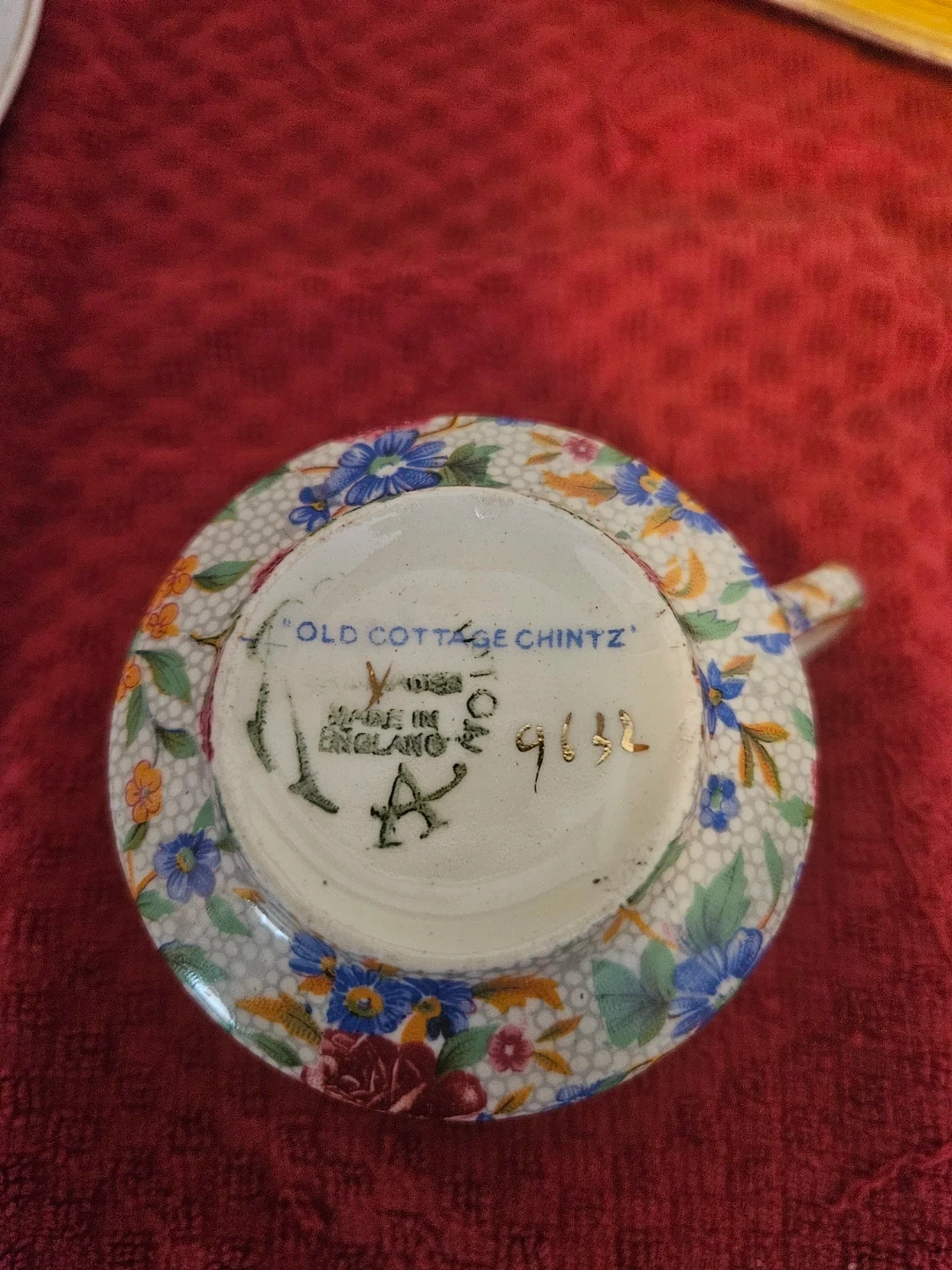 Royal Winton Old Cottage Chintz teacup. It's made of porcelain and features a detailed floral pattern with gold trim. Small chip to rim.