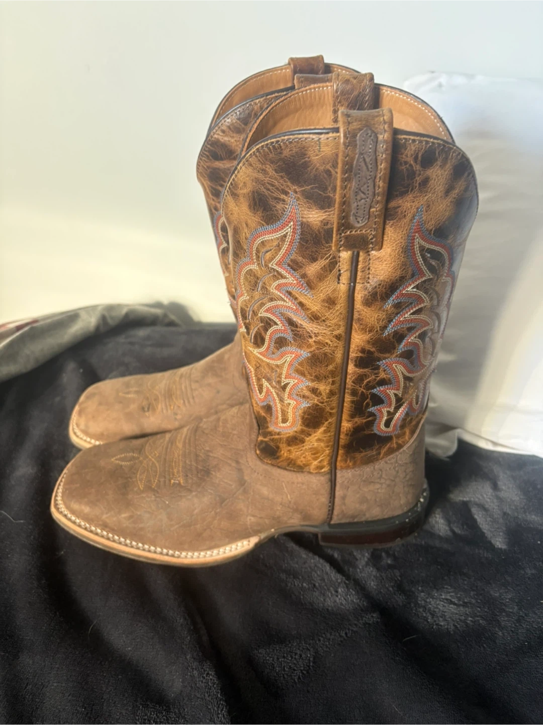 These Old West cowboy boots are made with a leather upper and a size 9.0-EE width. They feature intricate stitching on the shafts and a distressed brown finish. Perfect for rodeo or everyday wear!