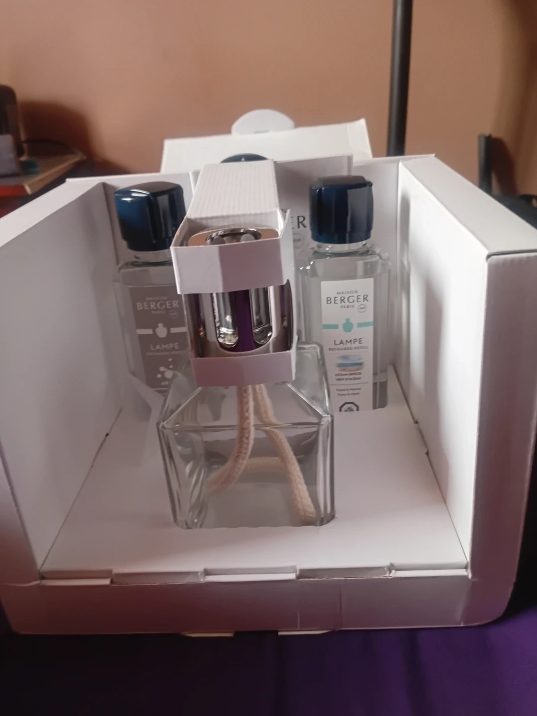Maison Berger Paris Lampe L'Essentielle gift set. Includes the diffuser and two fragrance refills. Purifies and perfumes the air. Essential for refreshing any room!