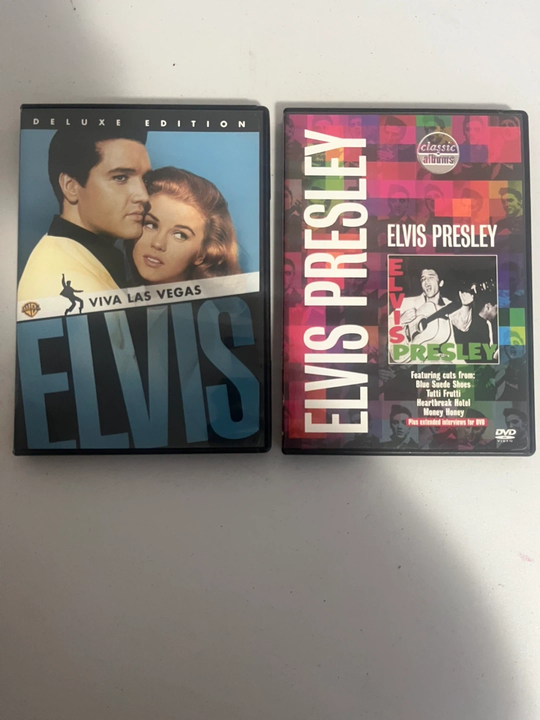 This set includes the Elvis Presley "Viva Las Vegas" Deluxe Edition DVD and the "Classic Albums" DVD. The Classic Albums DVD features cuts from "Blue Suede Shoes", "Tutti Frutti", "Heartbreak Hotel", and "Money Honey". It also includes extended interviews.