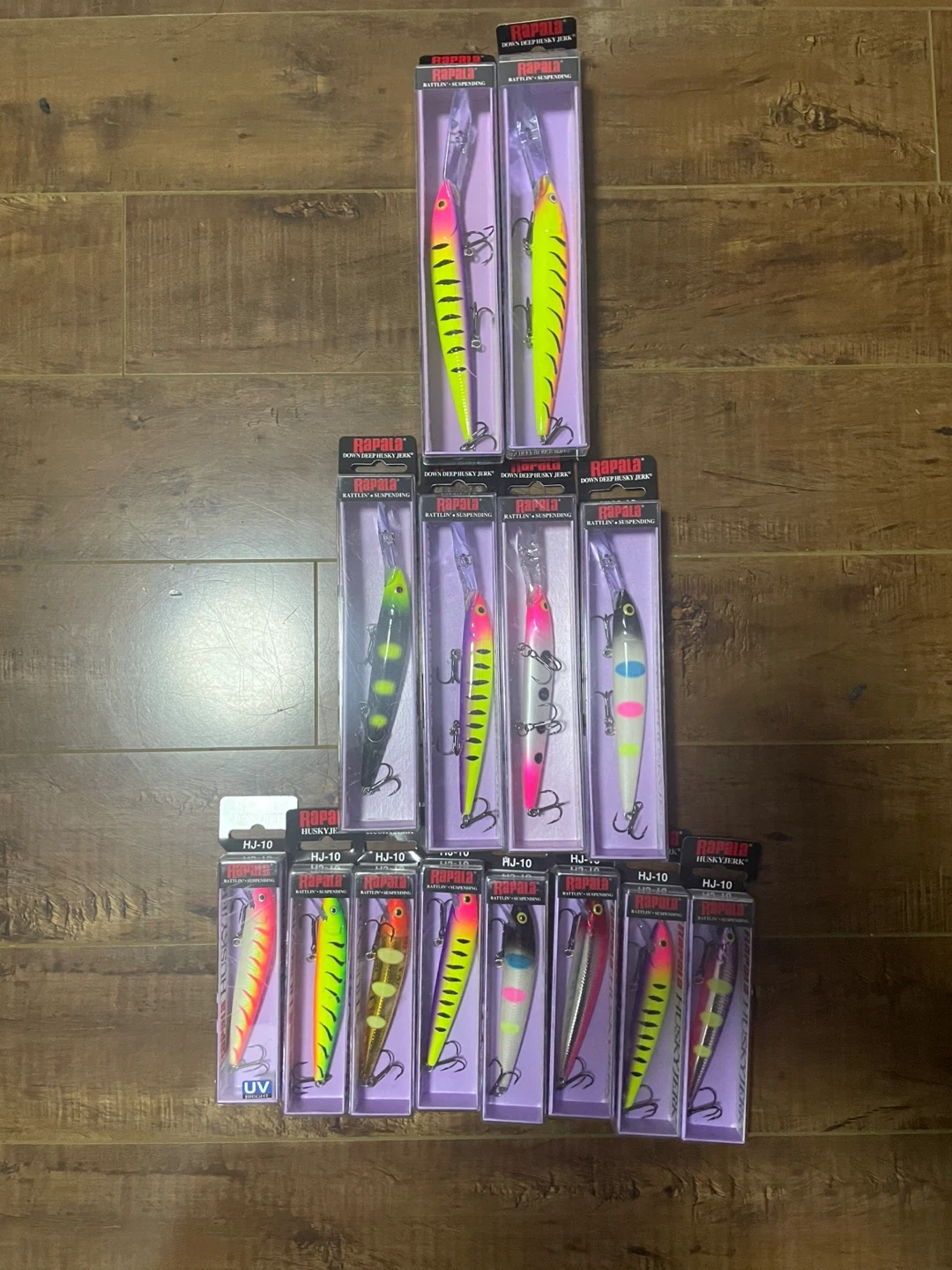 new Rapala Husky Jerk fishing lures. They're designed for suspending and rattling. Includes various colours and patterns. This is a great collection for any angler!