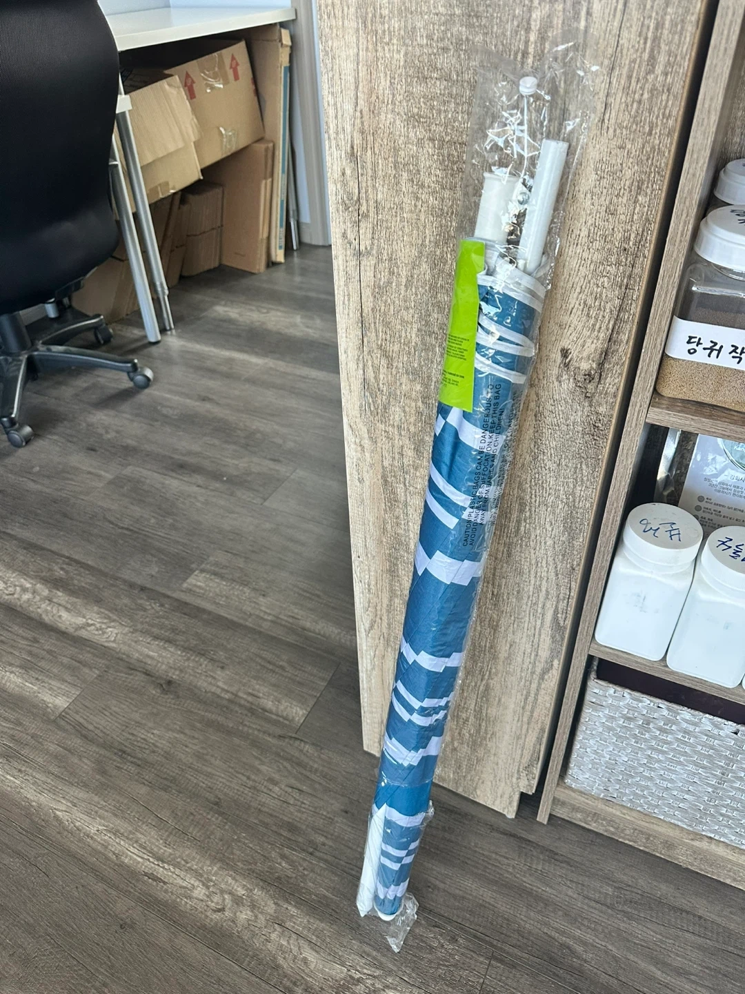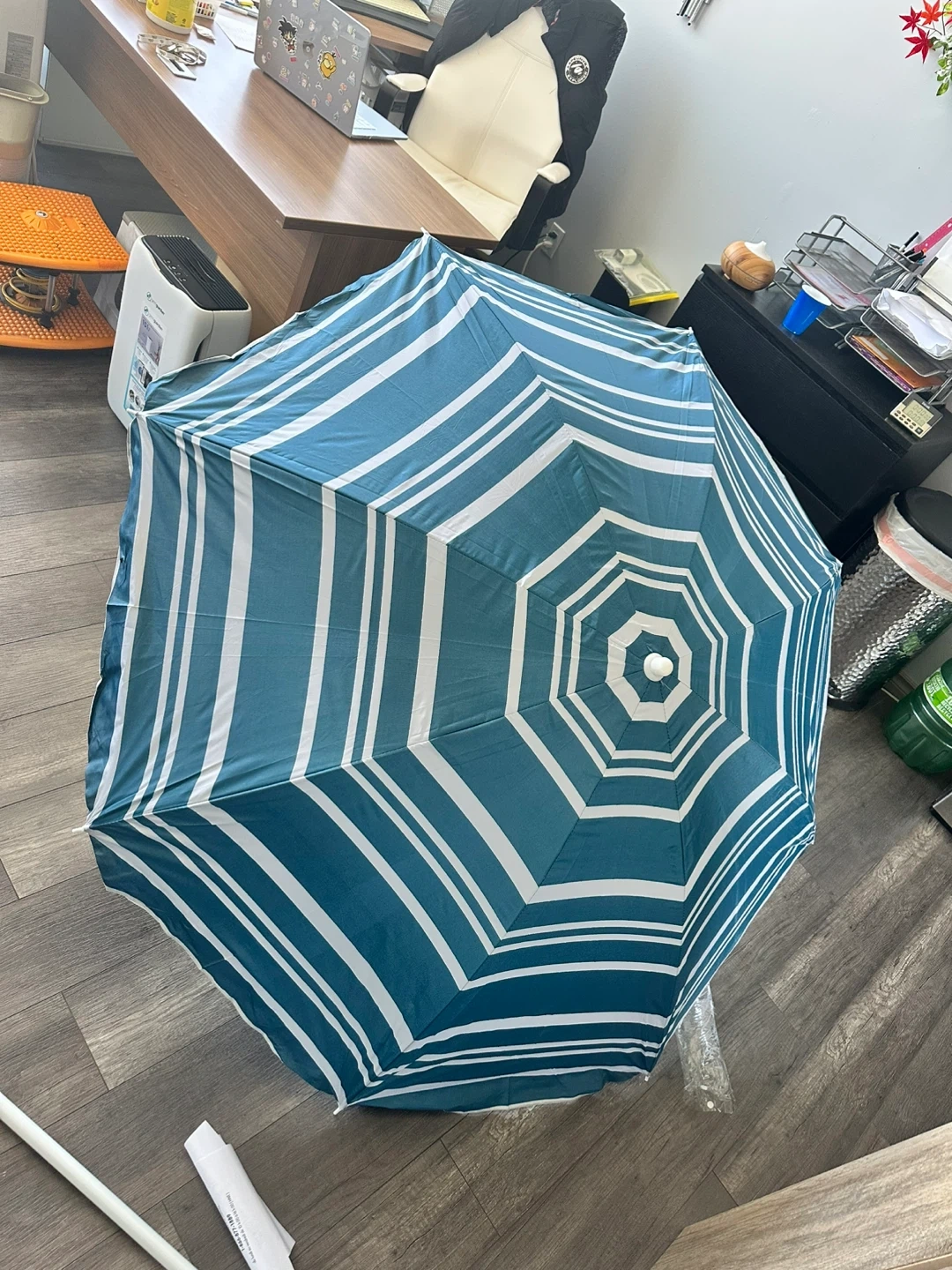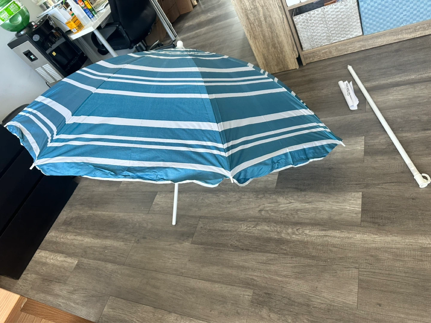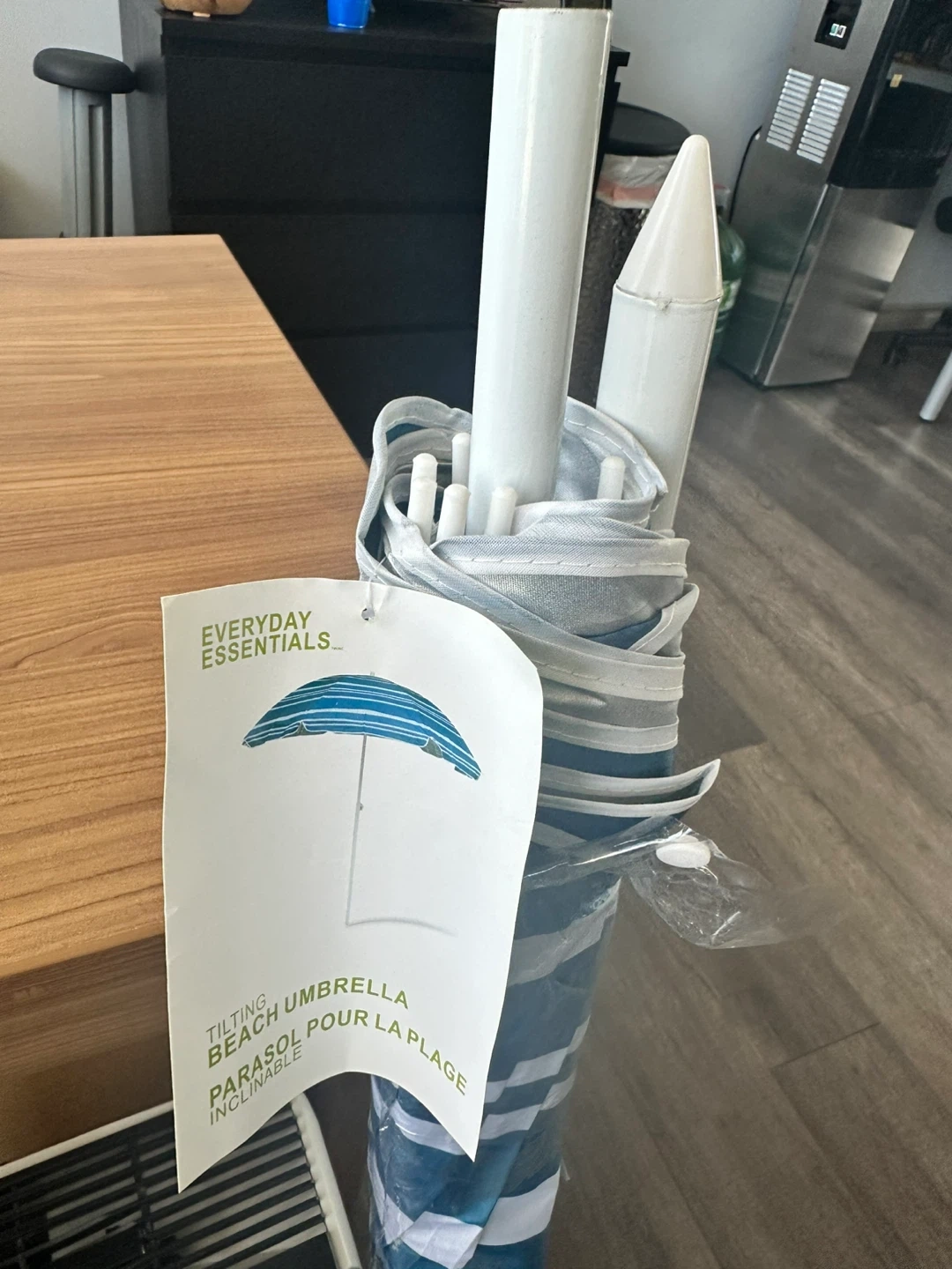 This Everyday Essentials beach umbrella offers sun protection with its blue and white striped design. It's a tilting umbrella, perfect for adjusting shade on sunny days. Includes a pole for setup.